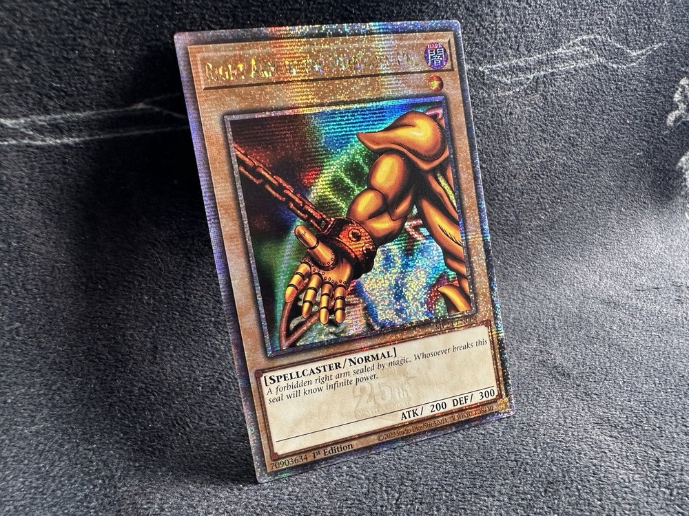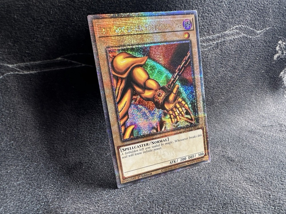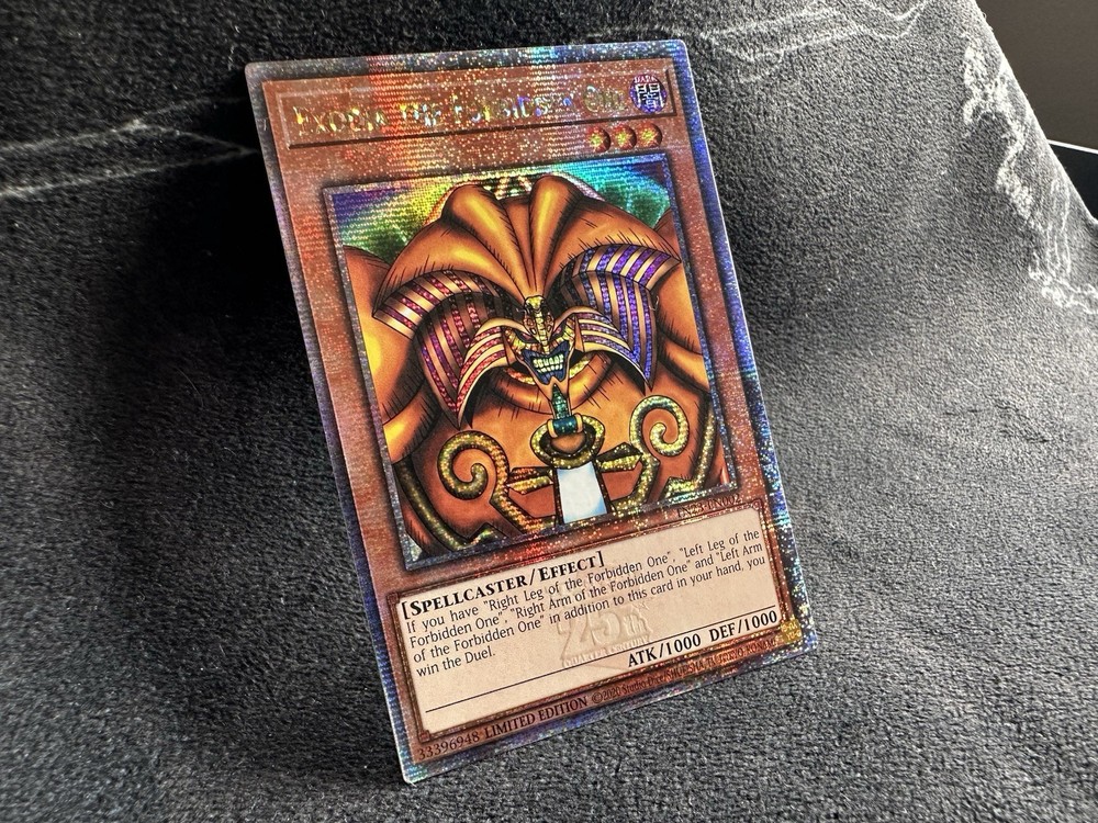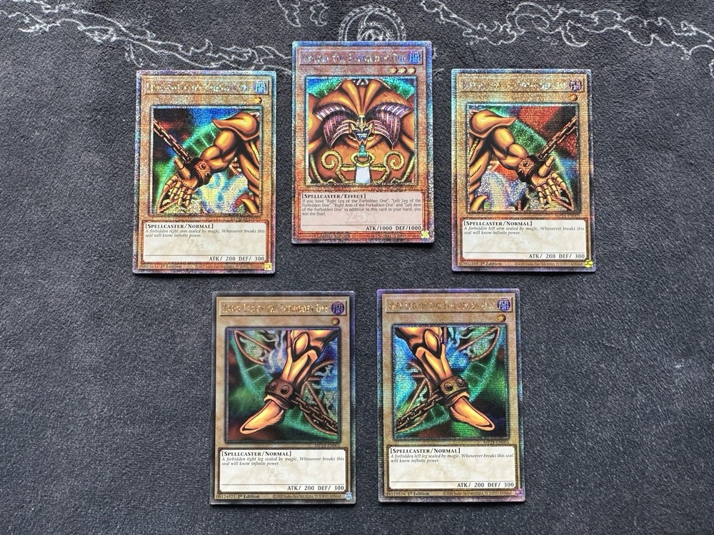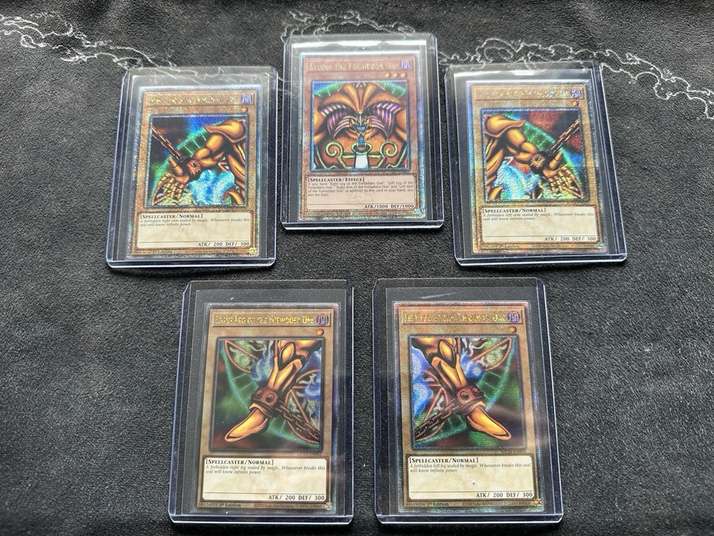 This listing is for five (5) near mint 1st Edition Quarter Century Secret Rare Yu-Gi-Oh cards! This COMPLETE EXODIA SET includes: (x1) Exodia the Forbidden One (x1) Left Arm of the Forbidden One (x1) Right Arm of the Forbidden One (x1) Left Leg of the Forbidden One (x1) Right Leg of the Forbidden One These cards are now out of print and will not be reprinted according to Konami so get them while you can! All cards come from a smoke-free and pet-free home, so buy with confidence! Please see photos for exact card condition! Will be promptly shipped double-sleeved in a top loader inside a bubble mailer to protect your cards!