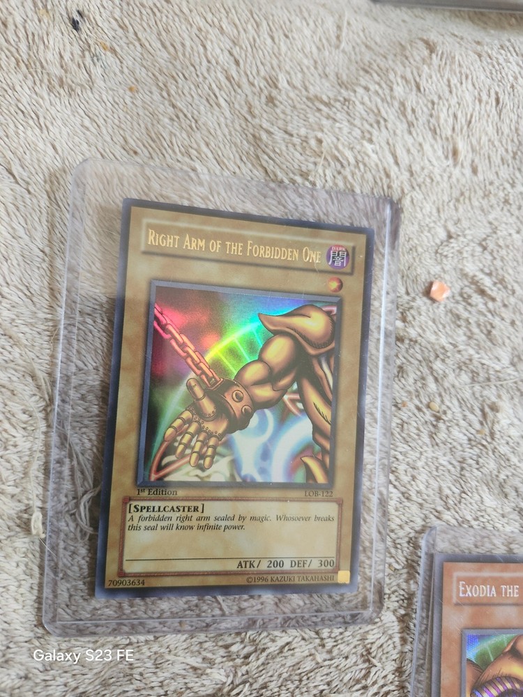 For sale is my Exodia The Forbidden set of 5 cards. this includes: DDS-003 Exodia the forbidden One LOB-120 Right Leg Of The Forbidden One LOB-121 Left Leg Of The Forbidden One LOB-122 Right Arm Of The Forbidden One LOB-123 Left Arm Of The Forbidden One All cards have been in hard shell sleeves since purchased over 20 years ago and are in near mint Condition.