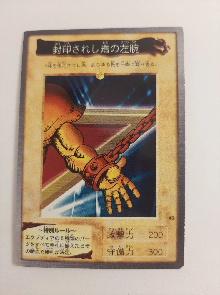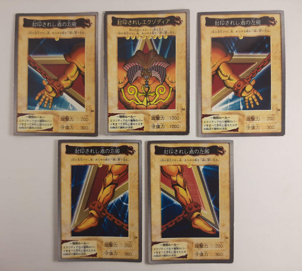 Full 5 Piece set of Exodia the Forbidden one. What you see is what you get so please look at the pictures clearly. not near mint and i wont pretend they are. Feel free to let me know if you want more pictures on any of the cards. from a no smoke no pet home. Packaged with the whole kit and caboodle, sleeved plus top loaders to prevent damage during shipping. so buy with no worries that I can't package it.