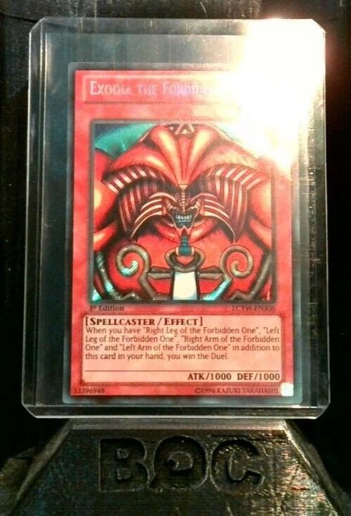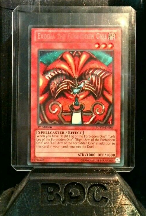 This near mint or better Exodia the Forbidden One card from Konami's Yu-Gi-Oh! TCG is a must-have for any collector. As a secret rare 1st edition card from the Legendary Collection 3: Yugi's World set, it features a foil finish and showcases Yugi Muto's signature monster. This standard-sized card is made of paperboard and has a defense/toughness of 1000 and an attack/power of 1000. This Spellcaster monster is a Dark attribute and is an iconic part of the Yu-Gi-Oh! franchise. The English language card is perfect for players and collectors alike. Don't miss your chance to own this legendary card. Card Text: If you have "Right Leg of the Forbidden One", "Left Leg of the Forbidden One", "Right Arm of the Forbidden One" and "Left Arm of the Forbidden One" in addition to this card in your hand, you win the Duel. Note: This item will be shipped with tracking.