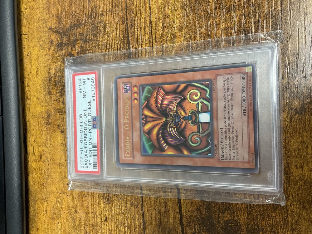Exodia the Forbidden One - LDB-P124 1st Edition PSA 8 Portuguese Graded Grading Scale -NM-Mint, this card is typically pack fresh and has no visible scratches or wear. -Light Play, this card might have minor wear around the edges but no major scratches or wear. -Moderate Play, this card might have moderate amount of wear around the edges and might have small scratches. -Heavy Play, this card might have heavy wear around the edges and could have major scratches or slight bends. -Damaged, this card will possibly be written on, water damaged, torn, bent, scratched, or have a heavy amount of wear. Important Information -PLEASE REQUEST AN INVOICE BEFORE PAYING IF THE SHIPPING COST IS INCORRECT ON YOUR INVOICE. -The winner of this auction will receive the item(s) listed in the title of this auction. -The condition is listed below the image in the description, or in the title of this auction. -The picture(s) included in our auctions are often stock photos. -We reserve the right to limit orders to only 4 copies of a single card for any reason. If you want to buy more than 4 copies please email us before making your order. Failure to do so may result in a cancelation of your order. -We expect payment within 4 days of the end of the auction. There are no exceptions to this policy. -Combined shipping is only offered on items won within 4 days of each other, paid for on the same invoice. -Shipping and Handling rates are not negotiable. Please make sure you understand the costs before bidding. Shipping information Domestic Shipping -All orders under $50 are shipped in a toploader and envelope for FREE! -All orders over $50 are shipped via tracking in a bubble mailer for FREE! International Shipping -All orders under $100 are shipped in a toploader and envelope for $3.00, each additional item is $.25. -All orders over $100 are shipped via bubble mailer and will require registered mail at the cost of $20, each addition item is $.50 ______________________________________________________________________________________ Please contact us before leaving neutral or negative feedback and give us a chance to fix whatever issue or problem you have with your order. Thank you from the Wasteland!