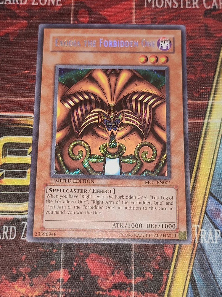 Exodia the Forbidden One is a Spellcaster creature card from the Master Collection Volume 1 set in the Yu-Gi-Oh! TCG. This Secret Rare card has an Attack/Power of 1000 and Defense/Toughness of 1000. It is in English and is a Limited Edition card manufactured by Konami. We understand that the condition of the card is important to collectors, but rest assured that this card has been sleaved and protected. Add this powerful card to your collection today and show off your Yu-Gi-Oh! TCG prowess. Please note that this item is sold as is, with the condition shown in photos and description. We invite you to browse our full range of Yu-Gi-Oh! cards and add this rare gem to your collection today.