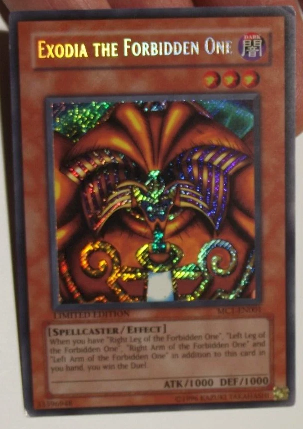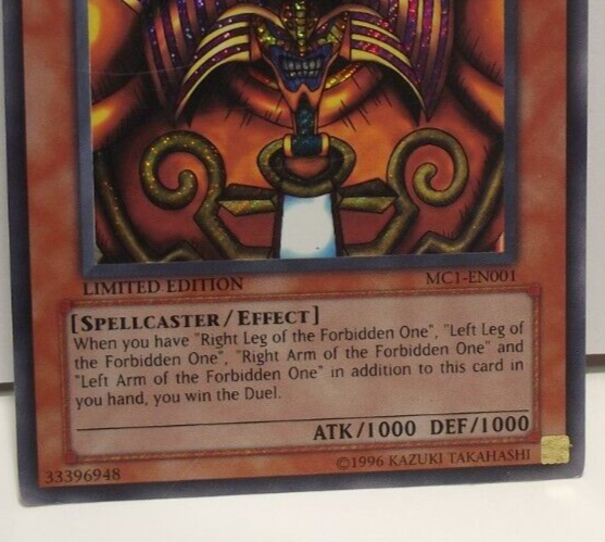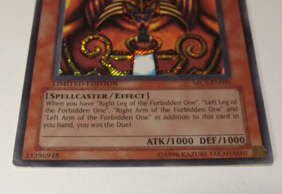 Exodia the Forbidden One Master Collection LIMITED EDITION 1996 Volume 1 MC1-EN001 Yu-Gi-Oh! TCG Lightly used and in great condition, has lived in a sleeve and binder. Please See and enlarge photos as they are part of the description and of the EXACT item you will recei ve. Feel free to ask any questions or request more photos. BID WITH CONFIDENCE- 19 + Years Selling on ebay!! *** NO RESERVE!*** FREE USPS FIRSTCLASS SHIPPING Insured USPS PRIORITY and FedEx SHIPPING Also Available UNLESS OTHERWISE SPECIFIED BUYER IS TO PAY ACTUAL SHIPPING COSTS CALCULATED BY WEIGHT AFTER PROFESSIONAL PROTECTIVE PACKAGING. All items shipped within ONE business day after Payment is cleared. Sorry NO international shipping. I only ship to the address you have registered with eBay Contact us Any and all communication should be done through the " Contact Seller " link in the item description(My Messages)