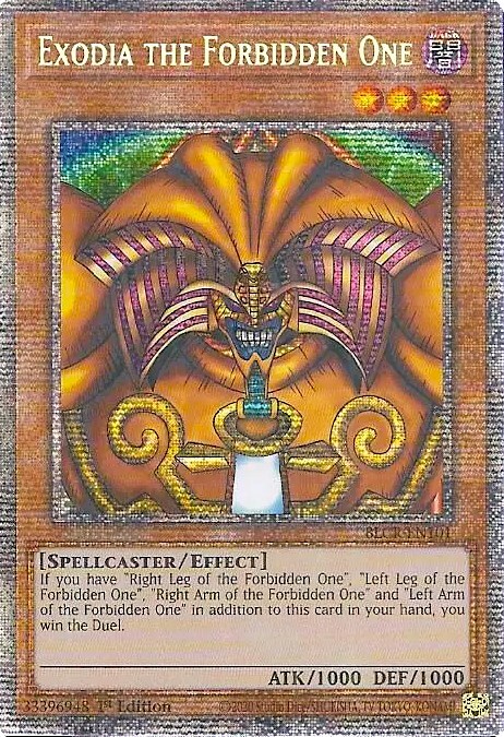Unleash the power of the legendary Exodia the Forbidden One from the Battles of Legend: Crystal Revenge set, card number BLCR-EN101. This Starlight Rare card boasts an impressive 1000 attack and defense power, ensuring it can withstand even the most formidable opponents. As an Effect-type Spellcaster with Dark attributes, it's a formidable addition to any Yu-Gi-Oh! TCG arsenal. The card features the iconic Crystal character and comes in English language, making it a must-have for both players and collectors alike. Produced by Konami, this 1st Edition Exodia card is a true gem from the 'Battles of Legend: Crystal Revenge' series, ready to make a significant impact in your next duel.