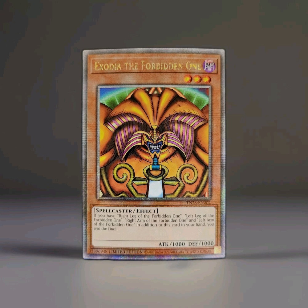 The "Exodia the Forbidden One TN23-EN002" card is a Quarter Century Rare Limited Edition card from the Yu-Gi-Oh! TCG, featuring the character Yugi Muto. This Spellcaster creature card is in Dark color with a Holo finish, manufactured by Konami in 2023. The card is signed by 5ban Graphics and is made of card stock, suitable for standard gameplay. This highly sought-after card is sure to be a valuable addition to any collector's deck.