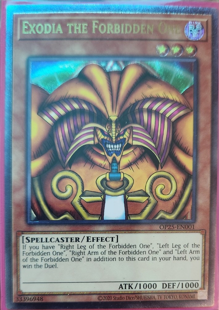 Unleash the power of Exodia the Forbidden One, a legendary addition to your Yu-Gi-Oh! TCG arsenal. This Ultimate Rare card, with card number OP25-EN001, is a must-have for collectors and competitive players alike. As an Effect-type Spellcaster with a formidable 1000 attack and defense, it can turn the tide of any duel. This English version card from OTS Tournament Pack 25 reflects the Dark attribute, fitting seamlessly into your strategic lineup. Compliance with the official tournament stores' Konami OTS agreement ensures its legitimacy in the game's highest stakes. Secure this iconic card and enhance your play with Exodia's unmatched prowess.