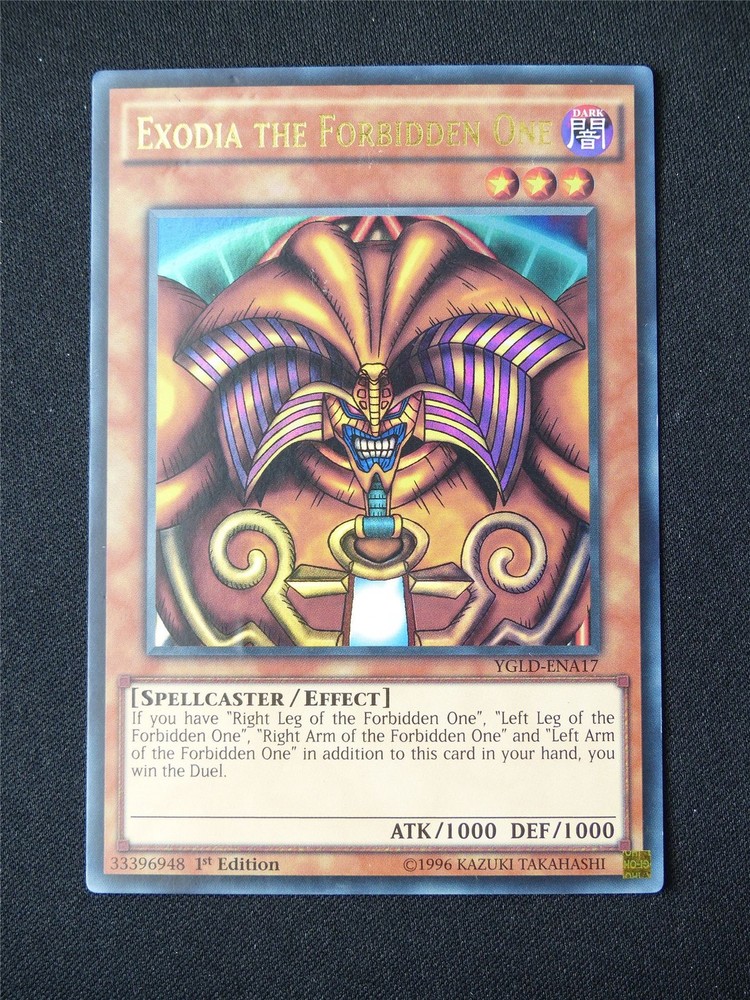 BUY 2, GET 3rd FREE !!! Just add 3 eligible items to basket. Exodia the Forbidden One YGLD Ultra Rare played - 1st ed Yugioh Card #1VK Our stock code: DAISY14-1VK Used. Card shows light wear - please see scan for condition and edition. Only pay shipping once no matter how many single cards you order! Offer includes worldwide shipping! If you would like any further information about this item, or have any problems with our products or with our service please get in touch with us - We'll do our best to help!