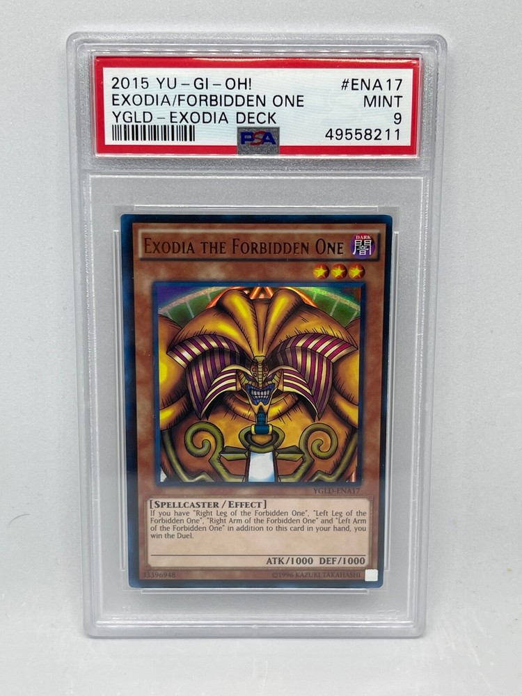 Exodia the Forbidden One You are bidding for a Exodia the Forbidden One YGL-ENA17 ULTRA RARE [PSA 9 MINT] 2015 YGLD Yu-Gi-Oh! What you see on the picture is the item you will be buying. This is a great item to buy for you or as a gift. Don't miss out on a great deal. All my singles cards I sold are put into a top loader and ship in a bubble envelope. All my decks I sold will be shrink wrapped in a plastic bag to keep all the cards together and will be ship in a bubble envelope. I require immediate payment on all Buy-It Now items so if you want to save on combine shipping, you have to make sure you use the Add to Cart. Winner agrees to pay $7.99 shipping and handling (card will be ship in a small flat rate box). Combine shipping for each additional card is $0.50. International shipping cost depend on eBay Global Shipping Program. No Combine Shipping for International. Winner must pay within 4 days of Auction won. This auction is only for serious bidder. Bid with Confidence. Also, check out my eBay Store. If you have any question please e-mail me. Thank you and have fun bidding.