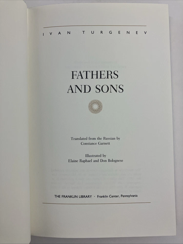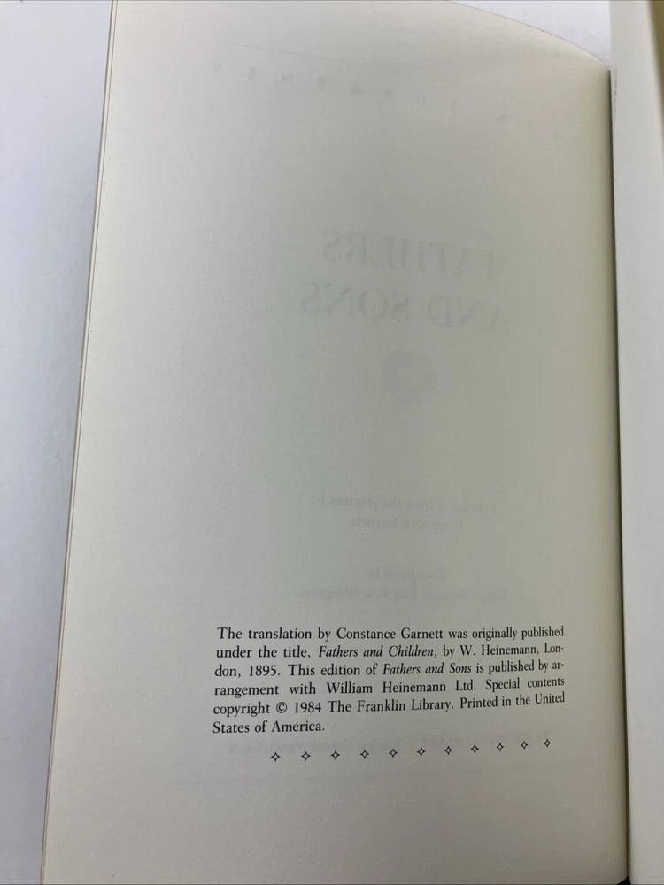 FATHERS AND SONS - TURGENEV - FRANKLIN LIBRARY 1984 EDITION LEATHER GOOD CONDITION -- CLEAN COPY/NO MARKINGS ON THE INSIDE (see pics) *Item will be protected well for shipping and comes with a tracking number for confirmation.* I ship out items every day so expect a quick delivery!