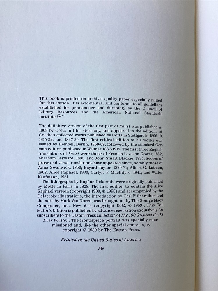 FAUST by Goethe 1980 Easton Press Leather Bound Collector's Edition. Not all original items are necessarily included. Please see pics for details. Please ask any and all questions prior to bidding or purchase. All sales final, no returns or refunds offered or accepted. Ground shipping to US lower 48 only. Media Mail used when available. Lastly please check our other auctions for more unique finds, great values and vintage pieces that pop. Thank you.