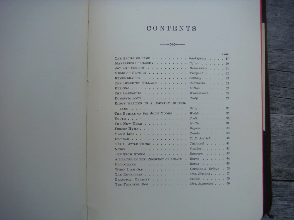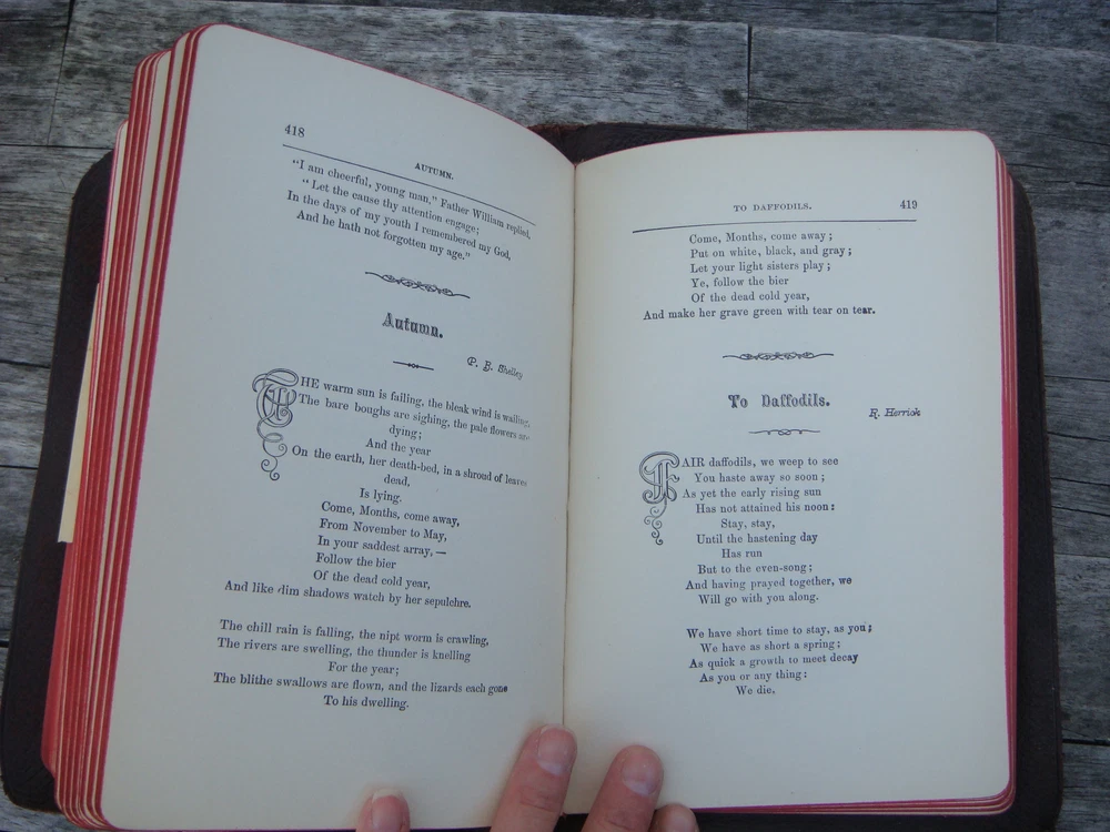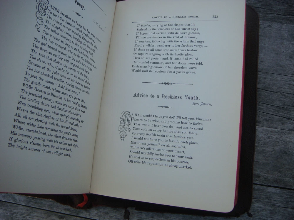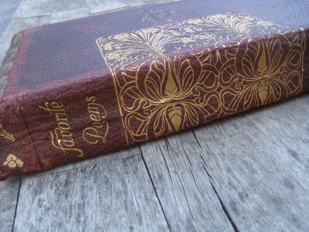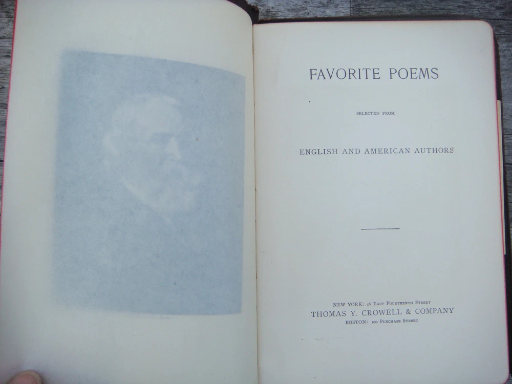 FAVORITE POEMS SELECTED FROM ENGLISH AND AMERICAN AUTHORS PRE-OWNED ITEM NEW YORK THOMAS Y. CROWELL AND CO. 1884 FIRST EDITION LEATHER COVER. 448pp. BURGANDY LEATHER WITH GILT DECORATION AND TITLE ON COVER AND SPINE. BOTTOM EDGES OF SPINE AND COVER ARE SLIGHTLY RUBBED AND WORN. ALL OF THE PAGES ARE IN EXCELLENT CONDITION! EXCELLENT COLLECTIBLE! SHIPS WORLDWIDE