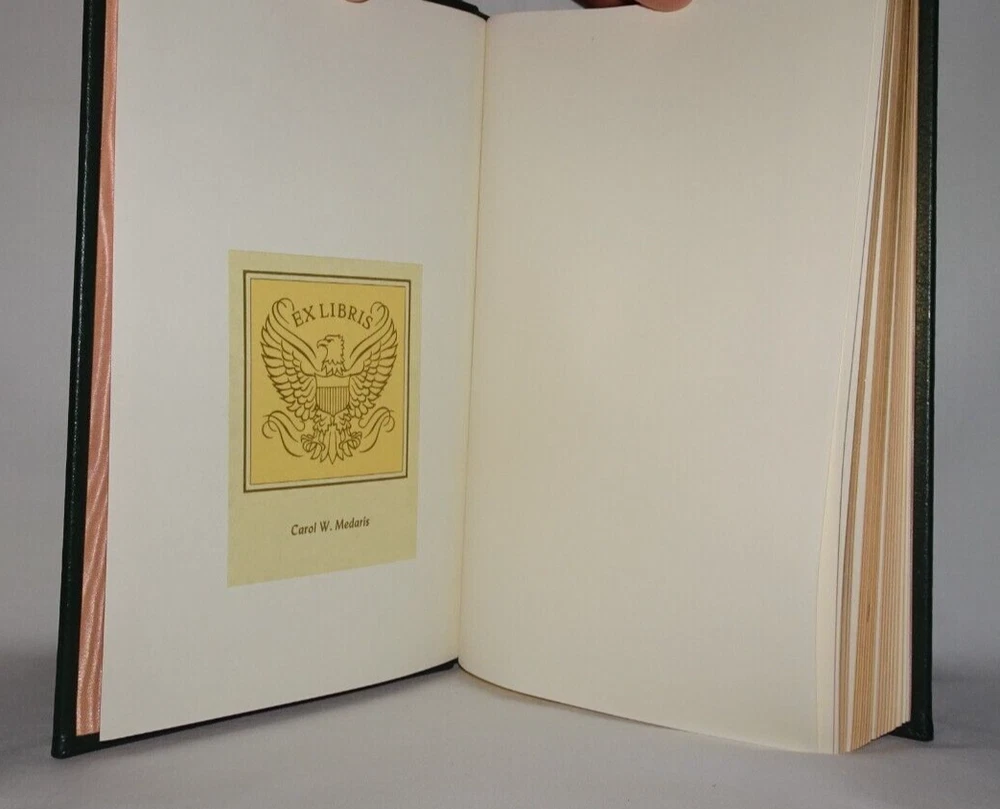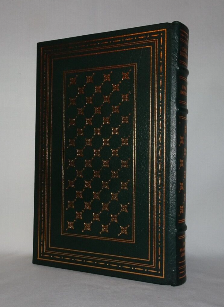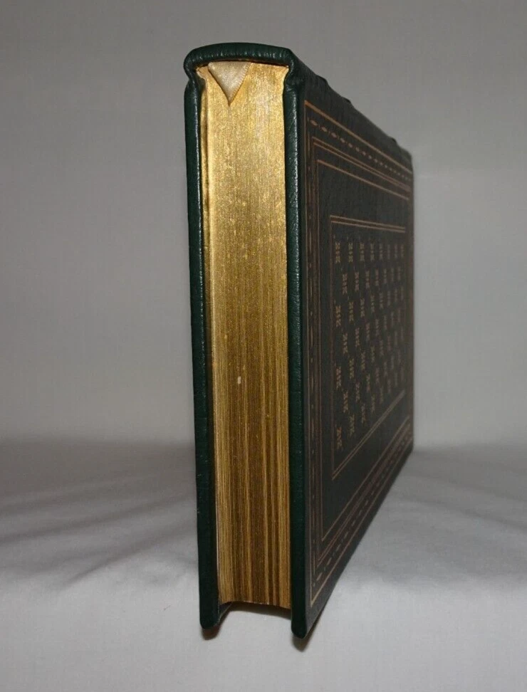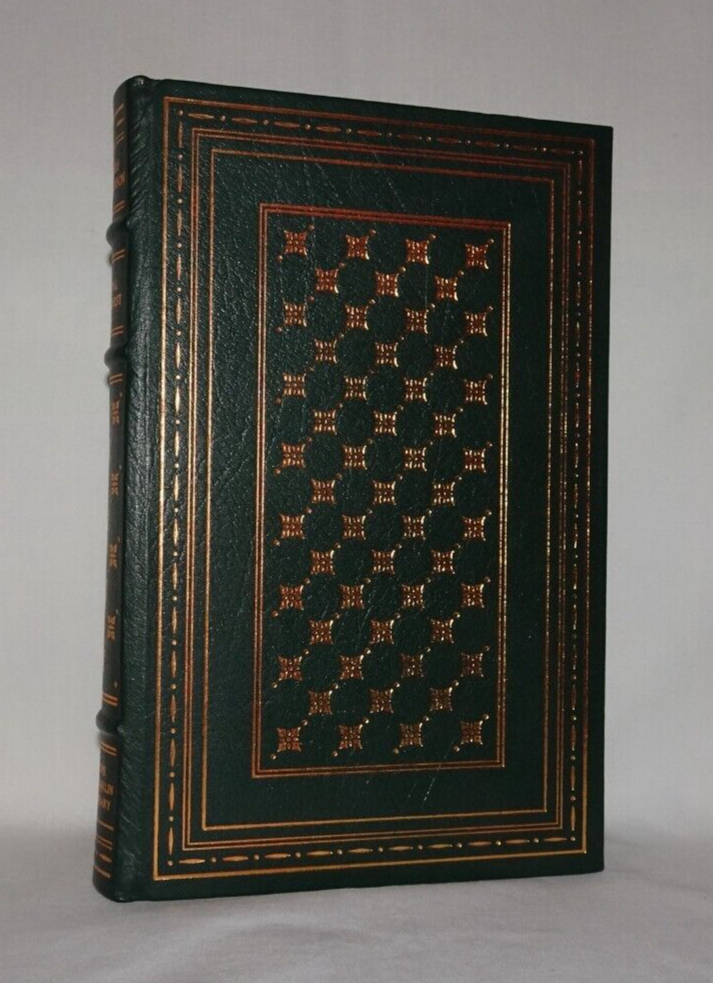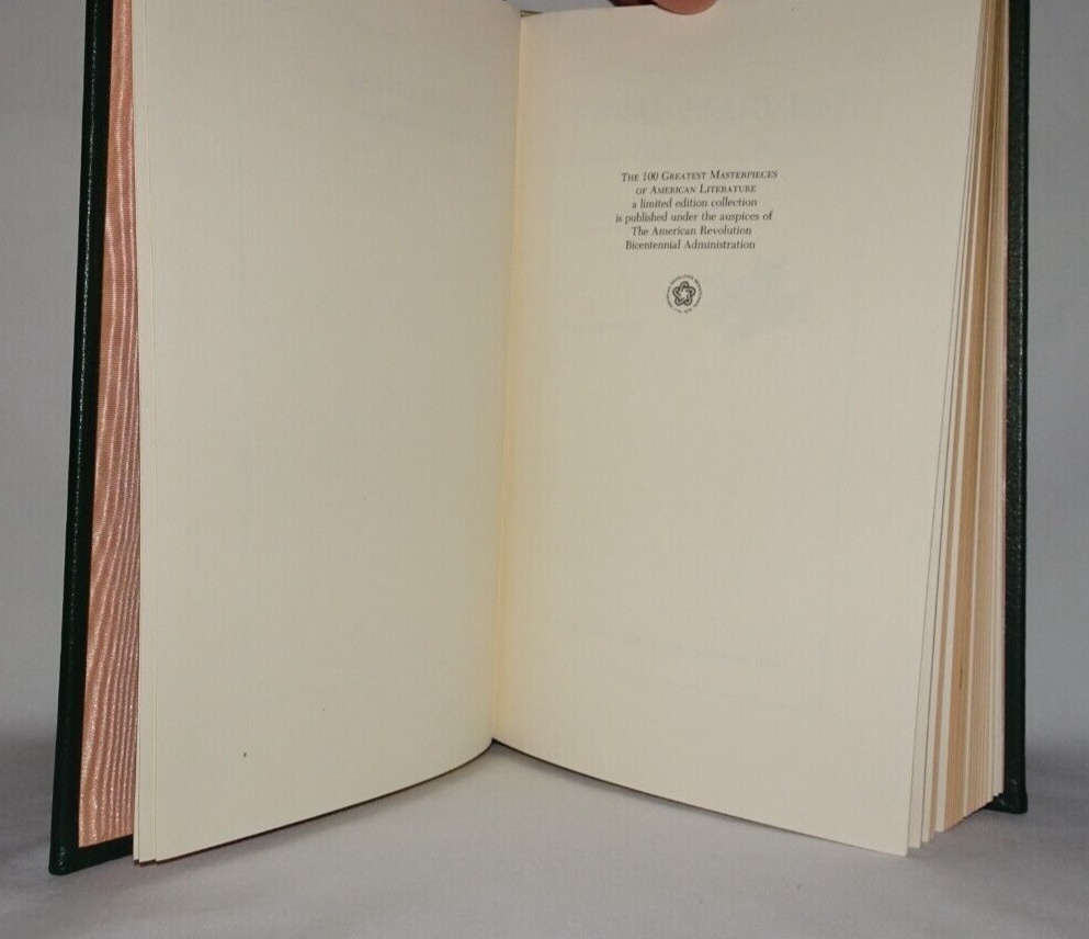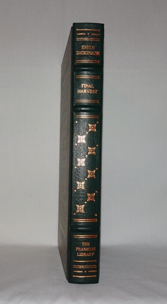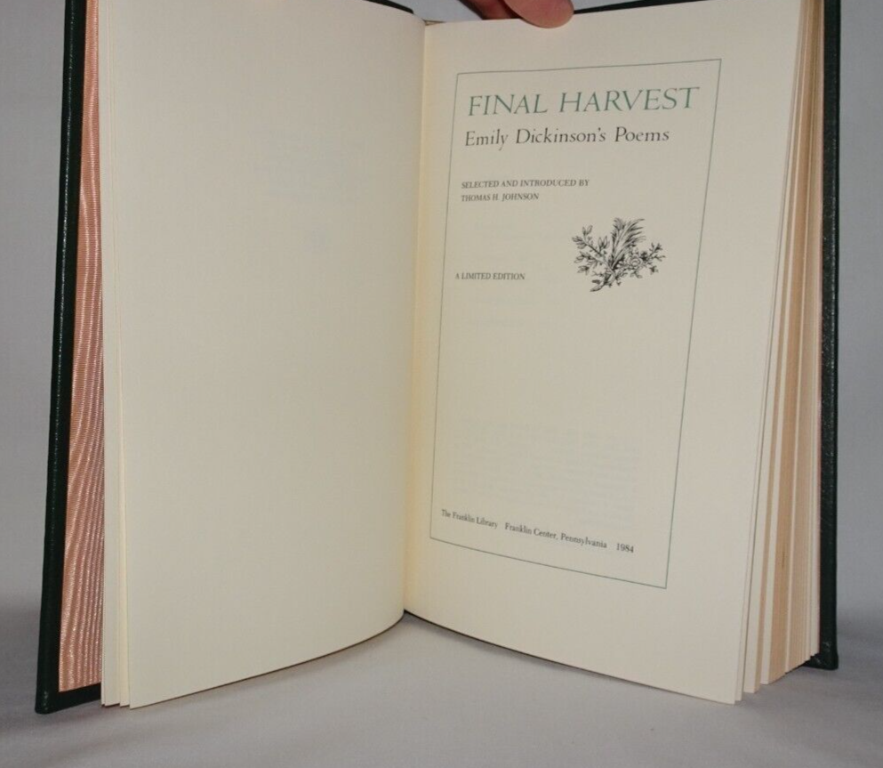 FINAL HARVEST Emily Dickinson's Poems Selected and introduced by Thomas H. Johnson Franklin Center, PA: Franklin Library, 1984, limited edition. A title in the Franklin Library series, The 100 Greatest Masterpieces of American Literature. Very good full leather-bound hardcover. Book is bound in green leather with gilt design on front and back boards, and gilt lettering and design on spine. Three raised bands on spine, sewn in silk bookmark, gilt on all edges of text, moire endpapers. Binding is square and tight. Previous owner's bookplate on back side of front free endpaper. Slight foxing to top edge of text. Slight discoloration to moire endpapers around edges.