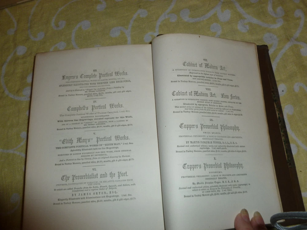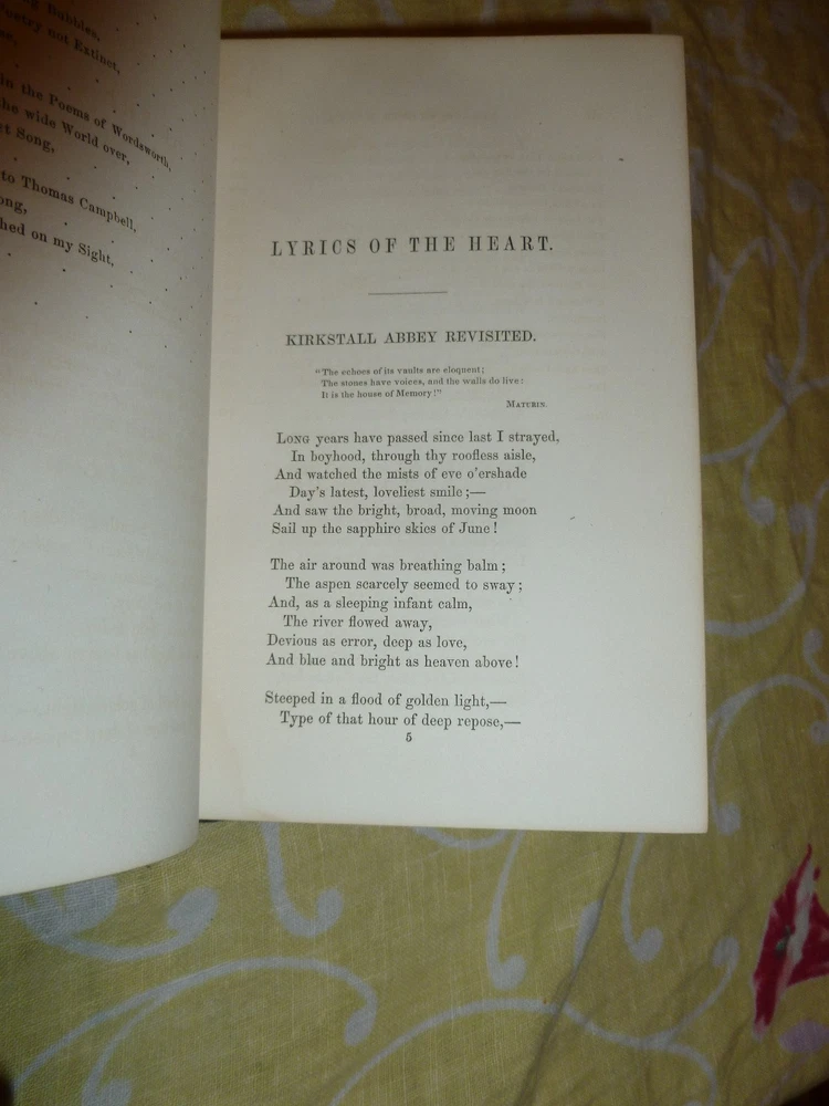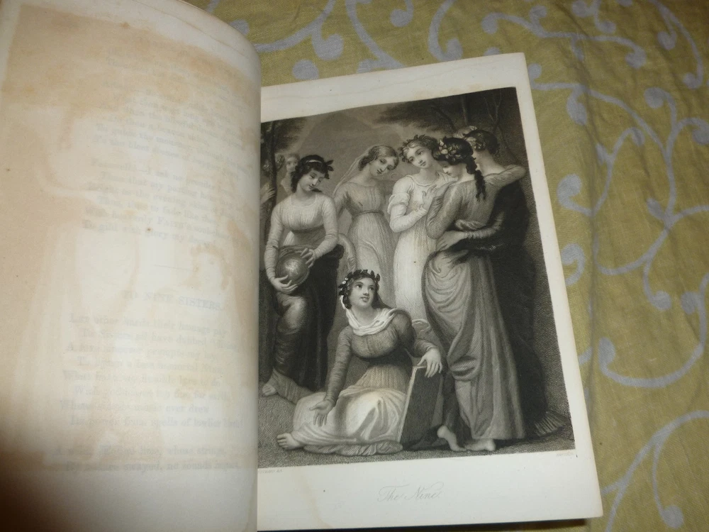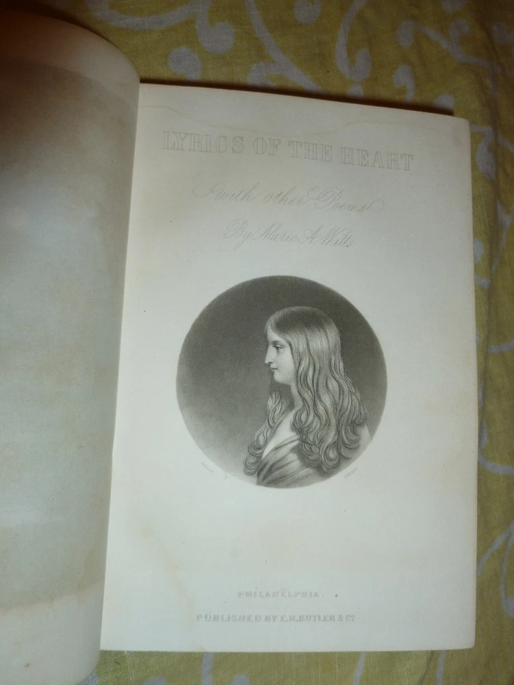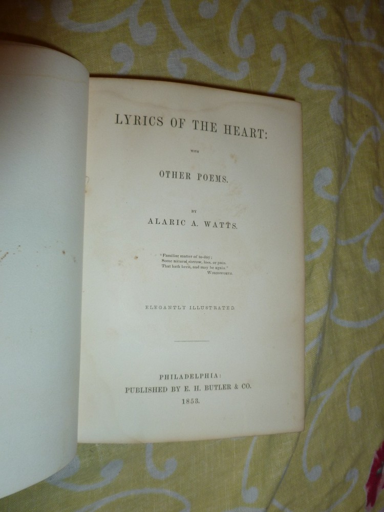 OFFERED HERE FOR YOUR VIEWING PLEASURE IS THIS FABULOUS LEATHER BOUND VOLUME: "LYRICS OF THE HEART". THE AUTHOR IS ALARIC ALEXANDER WATTS, 1797 - 1864. HE WAS BORN IN LONDON. FIRST PUBLISHED IN 1851, THIS BOOK WAS PUBLISHED IN 1853 IN PHILADELPHIA BY A. E. BUTLER AND COMPANY. WATTS WAS A JOURNALIST AND EDITOR AND FOUNDED MORE THAN ONE NEWSPAPER. THIS VOLUME IS ONE OF TWO BOOKS OF POETY WRITTEN BY HIM. THE BOOK IS HALF LEATHER BOUND. IT IS 244 PAGES IN LENGTH. THE OUTER BOARDS ARE MARBLED. THE SPINE HAS 5 RAISED BANDS. THERE ARE A NUMBER OF ENGRAVINGS. THE PAGE EDGES ARE GILDED. THINGS TO MENTION WITH RESPECT TO CONDITION.... THE VOLUME IS STILL TIGHTLY BOUND AND OVERALL THE PAGES ARE BRIGHT AND CLEAN. THERE IS WEAR TO THE LEATHER ON THE BOARDS INCLUDING WHAT LOOKS TO BE A TEAR OF THE THIN OUTER LAYER OF SKIN ABOUT AN INCH IN LENGTH AND MINISCULE TO ABOUT HALF AN INCH WIDE ON THE UPPER FRONT CORNER. THE BOARD CORNERS ARE WORN AND BUMPED. THE GUTTERS SHOW THE BEGINNINGS OF CRACKLING...MINOR BUT TO BE MENTIONED. THE MARBLING SEEMS TO BE DARKENED WITH AGE AND HANDLING...DO NOT KNOW IS THIS IS CLEANABLE. THERE IS OFFSETTING ON PAGES NEAR TO THE ENGRAVINGS. THERE IS FOXING ON THE BEGINNING AND ENDING PAGES OF THE BOOK. THIS WOULD MAKE A WONDERFUL GIFT...IF...YOU CAN GIVE IT UP! HAPPY BIDDING!