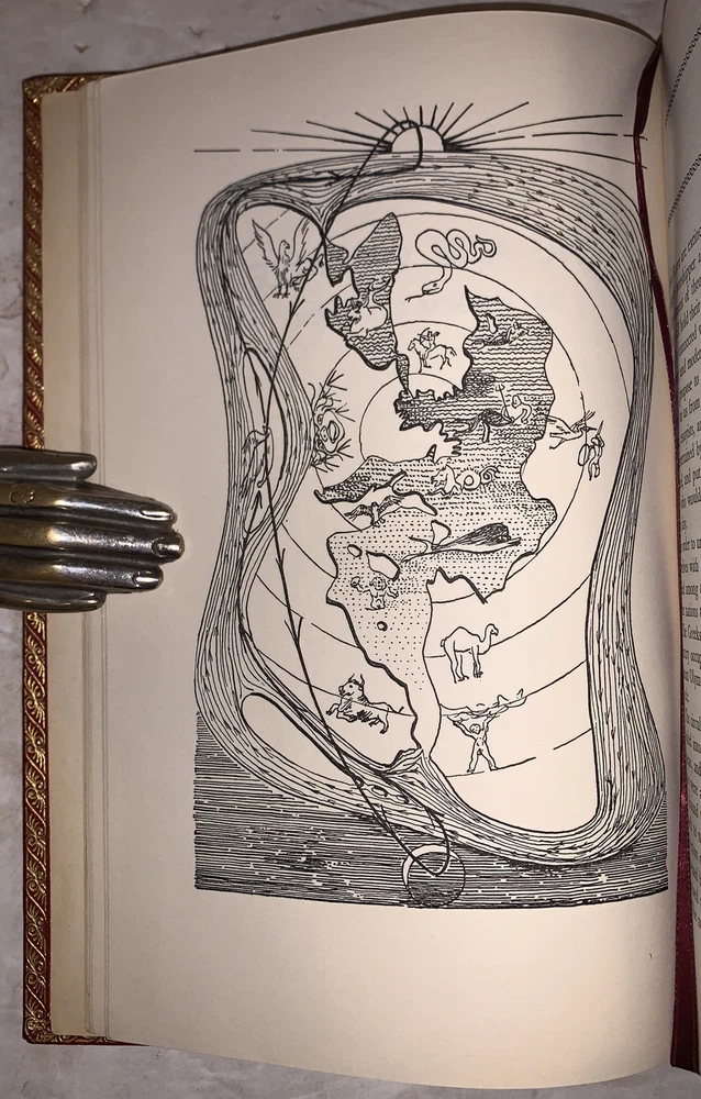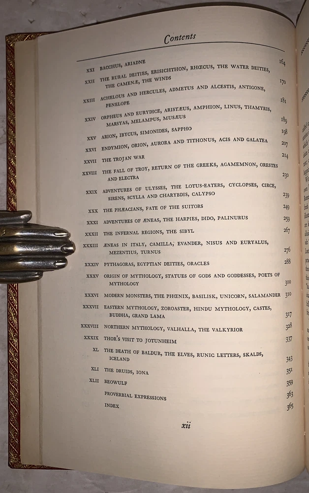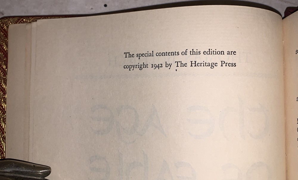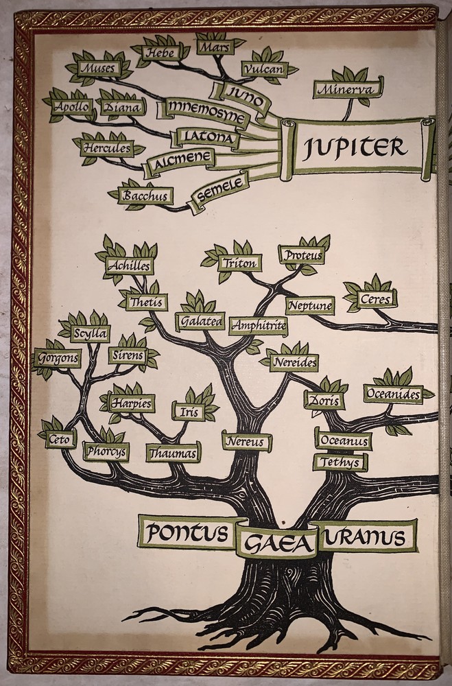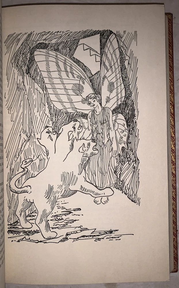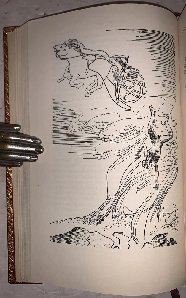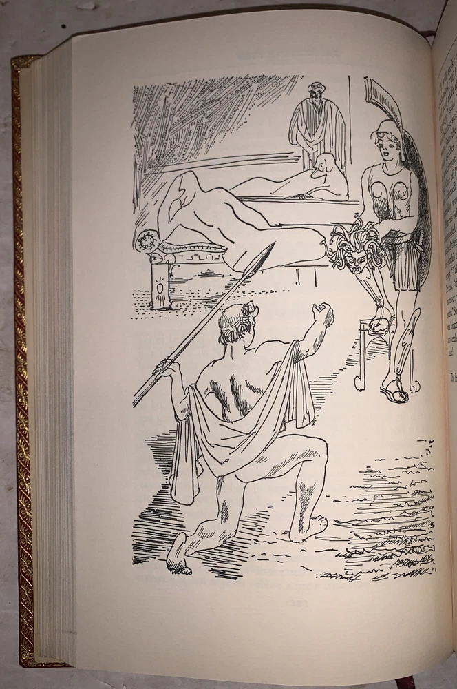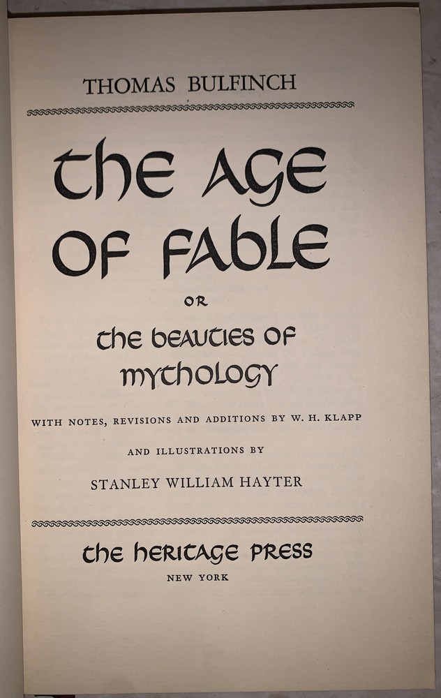Thomas Bulfinch The Age of Fable, or, The Beauties of Mythology With Notes, Revisions and Additions by W. H. Klapp and Illustrations by Stanley William Hayter New York: The Heritage Press 1942 Octavo, xvii, 369 pages, professionaly rebound in full crushed red morocco. With raised bands and gilt lettering to spine. Boards ruled in gilt. Inside gilt dentelles, top edge gilt. Pictorial endpapers, and illustrated throughout in black and white. Permanent silk place marker. Front hinge tender, previous owner's inscription, else in very good condition. If you have any questions feel free to ask and don't forget to check out my other listings.