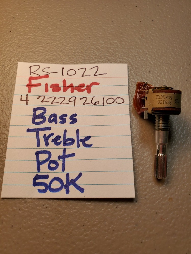 KNOBS WILL SHOW USE/WEAR NICKS>SCRATCHES>BLEMISHES>OXIDATION>…PCB’s ARE UNTESTED FOR PARTS/REPAIR ONLY…ALL OTHER ITEMS IN GOOD CONDITION EBAY AUCTION r u s t y n a i l a u d i o The Worlds Marketplace for Vintage Audio Parts M A K E A N O F F E R ! ! ! AUCTION ITEM: FISHER 4222926100 BASS TREBLE POT 50K RS-1022 STEREO RECEIVER . ITEMS ARE IN GOOD CONDITION...KNOBS WILL SHOW SIGNS OF USE/WEAR... REFER TO SERVICE MANUAL FOR YOUR UNIT TO VERIFY EXACT POSITION FUNCTION... #PLEASE READ: MY EBAY STORE IS SIMPLY A SOURCE FOR YOU TO FIND VINTAGE AUDIO PARTS... I'M JUST AN AVERAGE GUY TRYING TO MAKE A DIFFERENCE IN A VINTAGE AUDIO PARTS WORLD... WE SEARCH THE WORLD TO FIND THE PARTS WE HAVE... OUR PRICES REFLECT THE COST TO PROVIDE THESE PARTS.... CHECK OUR FEEDBACK, WE ACCEPT MOST BEST OFFERS... WE SELL ALL OUR PARTS "AS-IS" & "UNTESTED" (UNLESS NOTED IN ITEM DESCRIPTION)... r u s t y n a i l a u d i o The Worlds Marketplace for Vintage Audio Parts ITEMS ARE IN GOOD CONDITION...KNOBS WILL SHOW SIGNS OF USE/WEAR...REFER TO SERVICE MANUAL FOR YOUR UNIT TO VERIFY EXACT POSITION FUNCTION...