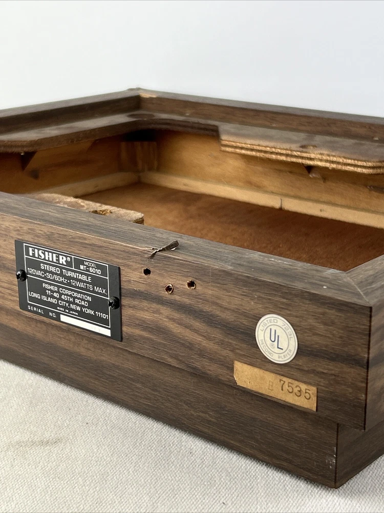 FISHER MT-6010 TURNTABLE BASE ORIGINAL. Used. Standard ship. NO HINGES, FEET OR BADGE. SOME MARKS AND OR SCRATCHES SEE PHOTOS FOR FURTHER DETAIL.