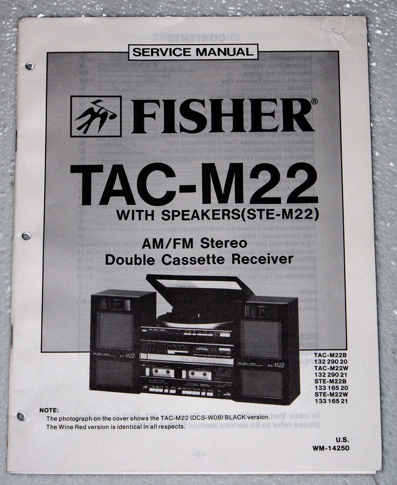 Fisher TAC-M22 (STE-M22) With Speakers | Original Service Manual AM/FM Stereo Double Cassette Receiver | Complete Service Manual & Parts List | Publication No. WM-14250 | 1985 Fisher Corporation Official Service Manual of the Repair Shops! This is the Official Service Manual that the shop technicians use. This is the real thing - not a copy or cheap knock-off. This manual was written by the manufacturer for their service technicians specifically for the component(s) listed. This ensures you get the job done right the first time . This manual covers operating instructions, specifications, disassembly, re-assembly, adjustments, repair, schematics, wiring diagrams and complete parts list. It is very detailed with good diagrams, photos and exploded views. A must for anyone who insists on Genuine OEM quality parts. Condition Very good condition (as pictured). Covers are clean. All pages are in place and straight. Page surfaces are clean. Shipping Usually Ships within 24 hours. Excluding weekends and holidays. United States: U.S. customers will be provided with the following two shipping options: 1) USPS First Class Mail. For envelopes under 13 ounces only. This provides for an inexpensive shipping option if you are not in a big hurry. Delivery times vary. 2) USPS 2 to 3 day Priority Shipping anywhere in the United States for a flat fee. Rest of the World: We will ship anywhere in the world. Customers outside of the U.S. will be provided with one or both of these two shipping options - depending on size and weight: 1) USPS First Class International postage may be offered if the item weighs under 4 pounds and is of regular size. USPS First Class International may take up to 2 to 3 weeks for delivery. 2) USPS Priority Mail International. Canada and Mexico quotes 4 to 10 day arrival. The rest of the world quotes a 7 to 15 day arrival. We will be happy to combine shipping charges on multiple items purchased. Payment We accept Paypal and all Major Credit/Debit Cards. Please follow the checkout procedure. We will usually ship within 24 hours of your cleared payment (unless otherwise noted). Thank you. Returns Returns are gladly excepted if item is not as portrayed in the description. Let us know of your return before sending. Please include the original packing slip. Service you can expect You can expect timely, courteous and professional service from us; as well as lightening fast shipping. Here are some examples of what people are saying: "Thank you so much! Your timely response and professionalism are very much appreciated. I wish you the best!" "Thanks for the quick responses and fantastic delivery. The manual arrived today....WOW!" "Exactly as ordered. Got here almost as fast as if it were teleported!" Order Now Before Stock Runs Out!