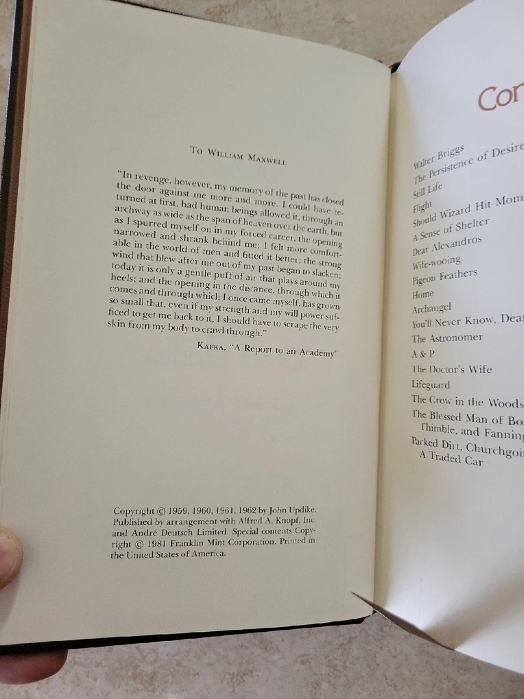 This rare and highly sought-after edition of Pigeon Feathers and Other Stories by John Updike is a must-have for any serious collector or literature enthusiast. The book is beautifully bound in leather, with gilt edges and intricate details that make it a true luxury edition. The author's masterful storytelling skills are on full display in this collection, which includes some of his most celebrated works. The pages are crisp and clean, with no signs of wear or damage. This collector's edition is a true treasure for anyone who appreciates the art of literature and the beauty of a well-made book.