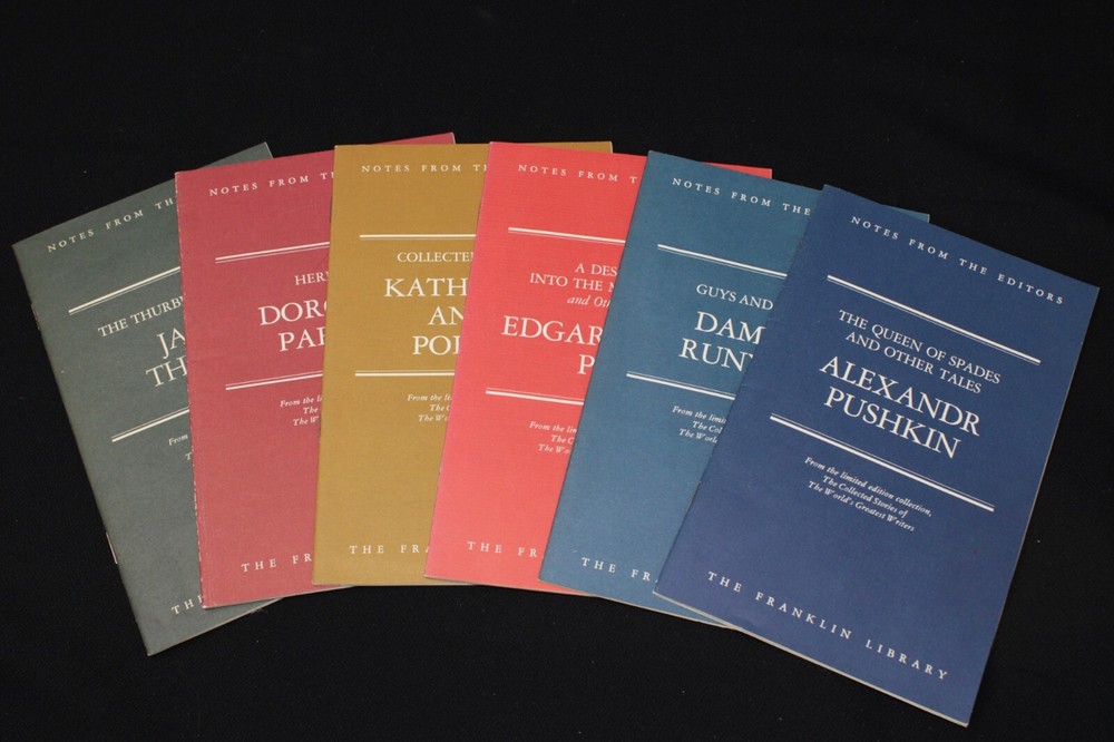 THE FRANKLIN LIBRARY Limited Edition Series "Collected Stories of the World's Greatest Writers", 5 different volumes, your choice! Price is PER BOOK - each includes its "Notes from the Editors" booklet. Full leatherbound with gilt embossed boards and all-edge gilding, ribbon page marker, and silk moire endpapers. Bindings are tight except where noted, pages are pristine & clean, no bookplates or personalization. ALEXANDR PUSHKIN - SOLD DAMON RUNYON Guys and Dolls - SOLD EDGAR ALLAN POE A Descent Into The Maelstrom and Other Tales. 1983, 359 pages. Near Fine Minus, with small waterspot on the top-edge gilding (pics #7-8.) KATHERINE ANNE PORTER - SOLD DOROTHY PARKER - SOLD JAMES THURBER - SOLD Please review all photos, as they are part of this description. (These are the actual books you will receive - I do not utilize stock photos.) Handsome additions to your library, and quite giftable too! Let me know upon purchase, which book(s) you are buying, and I will update this listing accordingly. And check my listings, I have many more Franklin Library books available, and I'm happy to combine shipping! The Fine Print… Check my feedback rating, and buy with confidence! Please contact me if you have any questions or concerns before bidding. Most of my items come from Estate Sales, are previously owned, and are in good vintage condition unless otherwise noted. Please expect incidental evidence of age and use, such as light scratches, dust, toning and fingerprints. Vintage linens are sold As Found – they have not been laundered. I do call out any noticeable stains, flaws or damage on all my items, so please read the descriptions closely and review all photos. Payment is expected at time of auction close or purchase . Your order will be Cancelled after 5 days if I do not hear from you, and the item will be relisted - you will also be blocked from bidding/purchasing from me in future. I am happy to work with you if unexpected circumstances arise – just let me know! Sales tax will be automatically added to your purchase by Ebay, for those states where it is required. I ship exclusively through the US Postal Service, and often I will upgrade you to Priority Mail at no additional cost. I also sell Internationally, those sales are shipped through Ebay (EIS .) Any customs and import charges are the responsibility of the buyer. Your purchase will be carefully packed – let me know immediately if it arrives in less than stated condition. If your item is damaged in transit, please send photos of the item(s) and box. If you are unhappy with your item for any reason, please reach out to me and I will do my best to resolve the issue for you. I will gladly combine shipping! If you purchase more than one item, please wait to pay until I send you an invoice, as the shipping cost is determined by the total weight of your purchases. Any significant shipping overcharges, will be refunded to you.