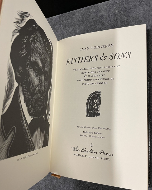 Lake Country Books presents ... Fathers and Sons [Easton Press 100 Greatest Books Ever Written] Author: Ivan Turgenev; Fritz Eichenberg [Illustrator] Publisher: Easton Press Release Date: 1977 Seller Category: Rare and Antiquarian Books:Contemporary Collectables:Easton Press Qty Available: 1 Condition: Used: Excellent Sku: FA42312020004 Notes: Excellent Collector's Edition copy with black leather cover. No significant flaws. No bookplates or ownership markings. Cover corners are square, binding is tight. Full leather cover features 22kt gold cover and spine lettering and decoration, specially milled acid-neutral paper, Smyth-sewn pages with gilded edges, and endsheets of moire silk with a permanent satin ribbon page-marker. From The 100 Greatest Books Ever Written collection. Beautiful copy. Don't forget to check out other great deals in our eBay Store!!