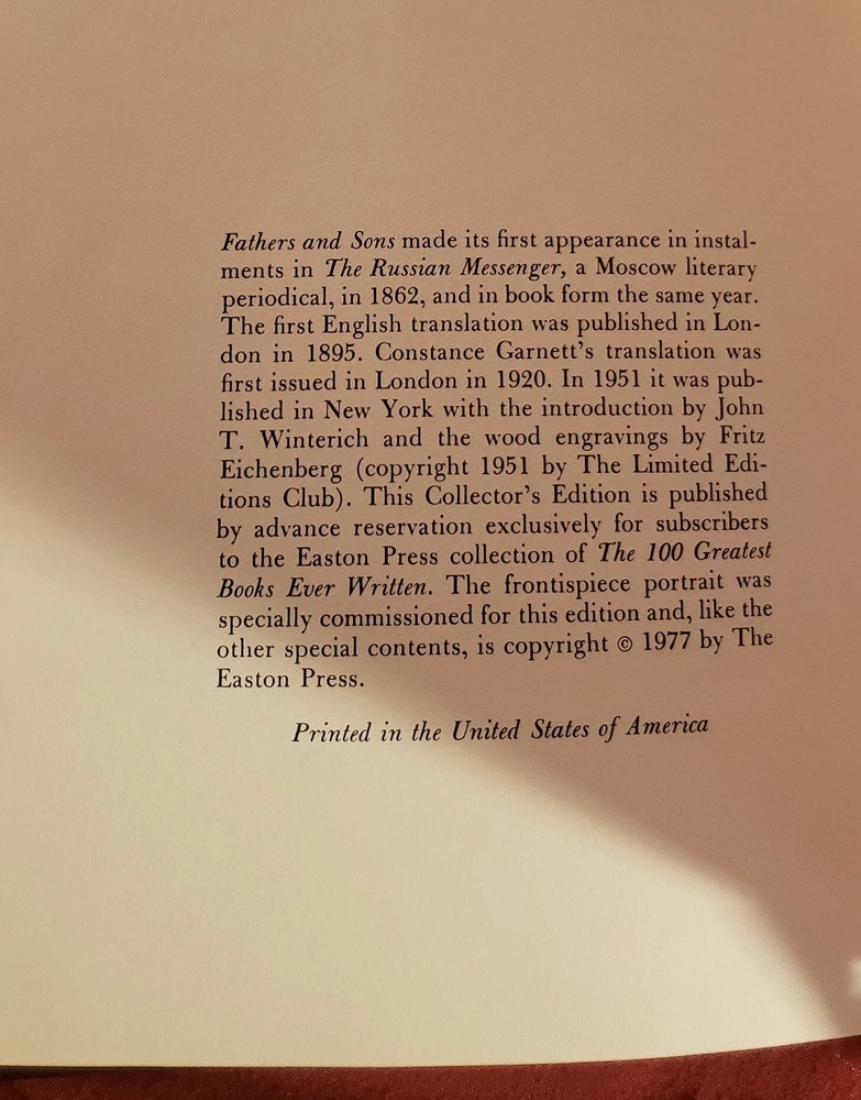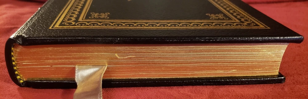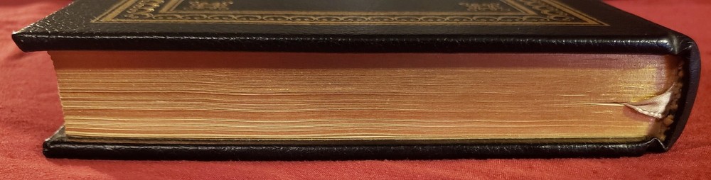 The Easton Press (1977), Norwalk, Connecticut, 1977. Collector's Edition, 9-1/2" x 6-1/4", 234 numbered pages. Part of the publisher's "100 Greatest Books Ever Written" series. Full leather. Condition: MINT. Bound in full decorated black leather stamped in 22kt gold, without dust jacket, as published. Moire end sheets with a matching silk book ribbon. Pages are Smyth-sewn into the binding for permanence. Archival-quality paper, page edges gilded on three sides. Illustrated with wood engravings by Fritz Eichenberg. Bound in the publisher's original full leather with the title gilded on the spine, along with four raised hubs. Decorations gilded on the covers, spine and all edges. Silk moire end papers. Hinging is in perfect condition. Has sticker of person choosen to have this as a gift in their library on first page (shown in pictures) Book will be shipped free of charge with the utmost care and expedience.