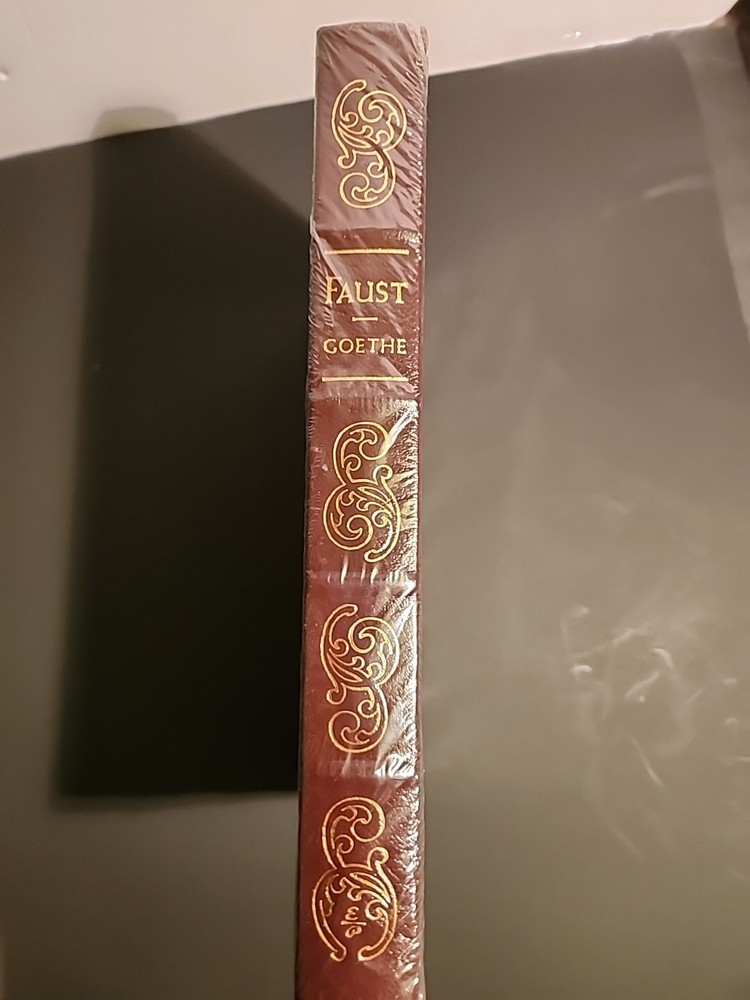 The product is a collector's edition leather-bound book titled "Faust" by Johann Wolfgang Von Goethe, part of the 100 Greatest Books Series by Easton Press. The book features illustrations by Eugene Delacroix and is intended for adults. It is a classic work originally written in English, published by Easton Press in the United States. Brand new in plastic.