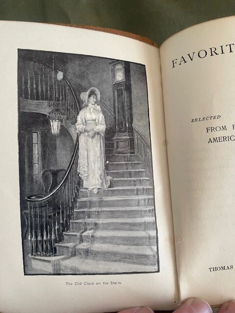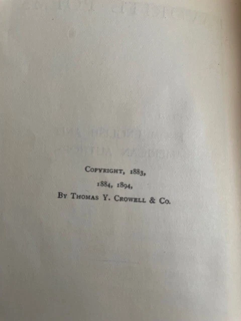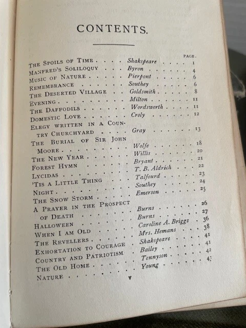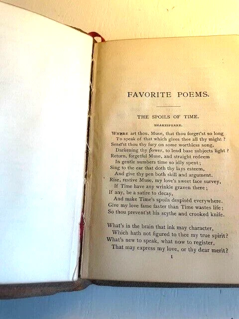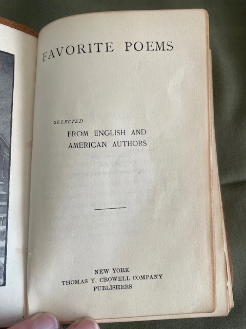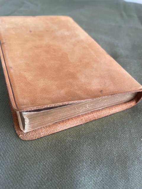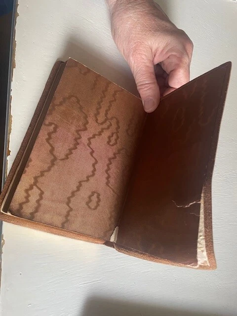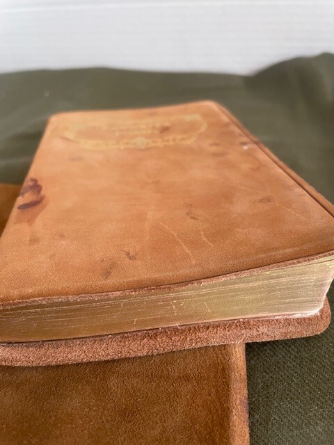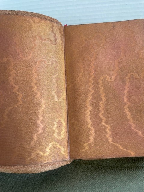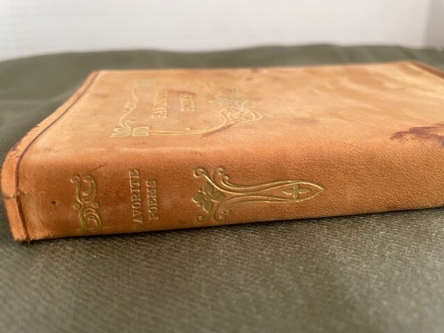 This beautiful little volume is bound in soft brown suede with gilded letters, and the inside front and back covers are paper that resembles moire silk. The inside back cover has a separation between the paper the leather cover. There is some separation of the first few front pages from the rest of the pages which are secure, and the front cover has a small stain (see photos). The pages and their gilt edges are clean. The book's small (4" x 6") size and soft cover add to its appeal. The book was published in 1894.