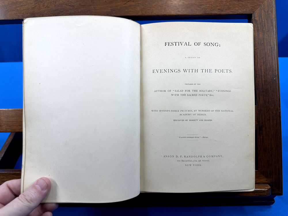 Festival of Song: A Series of Evenings with the Poets, c.1860's , Published by Anson D.F. Randolph & Co. , in Very Good condition. Some wear to leather boards. All edges gilt. Check out my other items. Shoppers within the United States can add my items to their cart, and request an invoice for combined shipping at checkout! Internal Code: DJS64