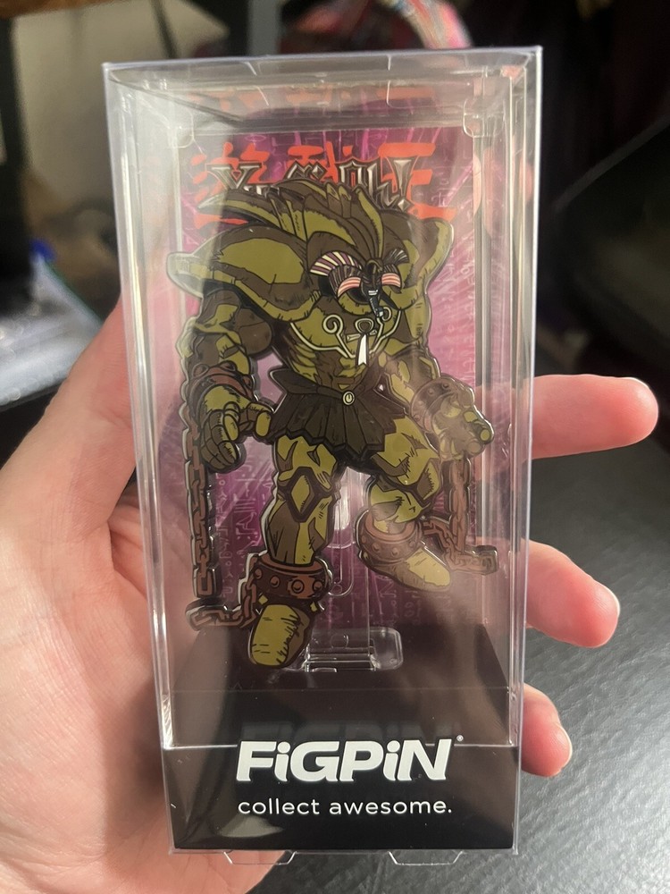 This collectible enamel pin featuring Exodia the Forbidden One from the popular Yu-Gi-Oh! franchise is a must-have for any fan. Measuring at ~3" in size and thickness, this button is made of cast zinc alloy and has a weight of 4.8 oz. The hard enamel design adds a touch of durability and the item is an original, licensed reproduction from FiGPiN. It's perfect for adding to a collection or wearing on a backpack or jacket. The pin is not signed and was manufactured in China. Don't miss out on the chance to own this unique piece of Yu-Gi-Oh! memorabilia.