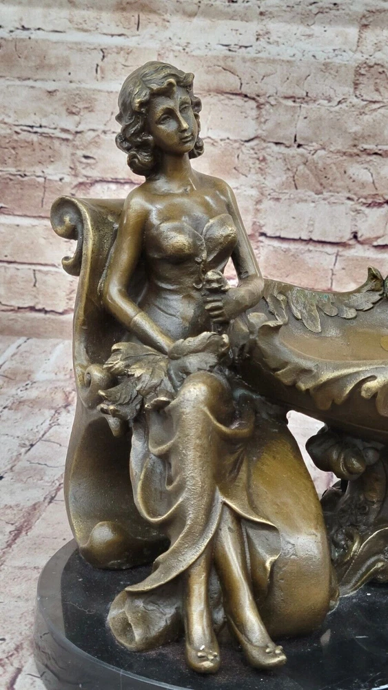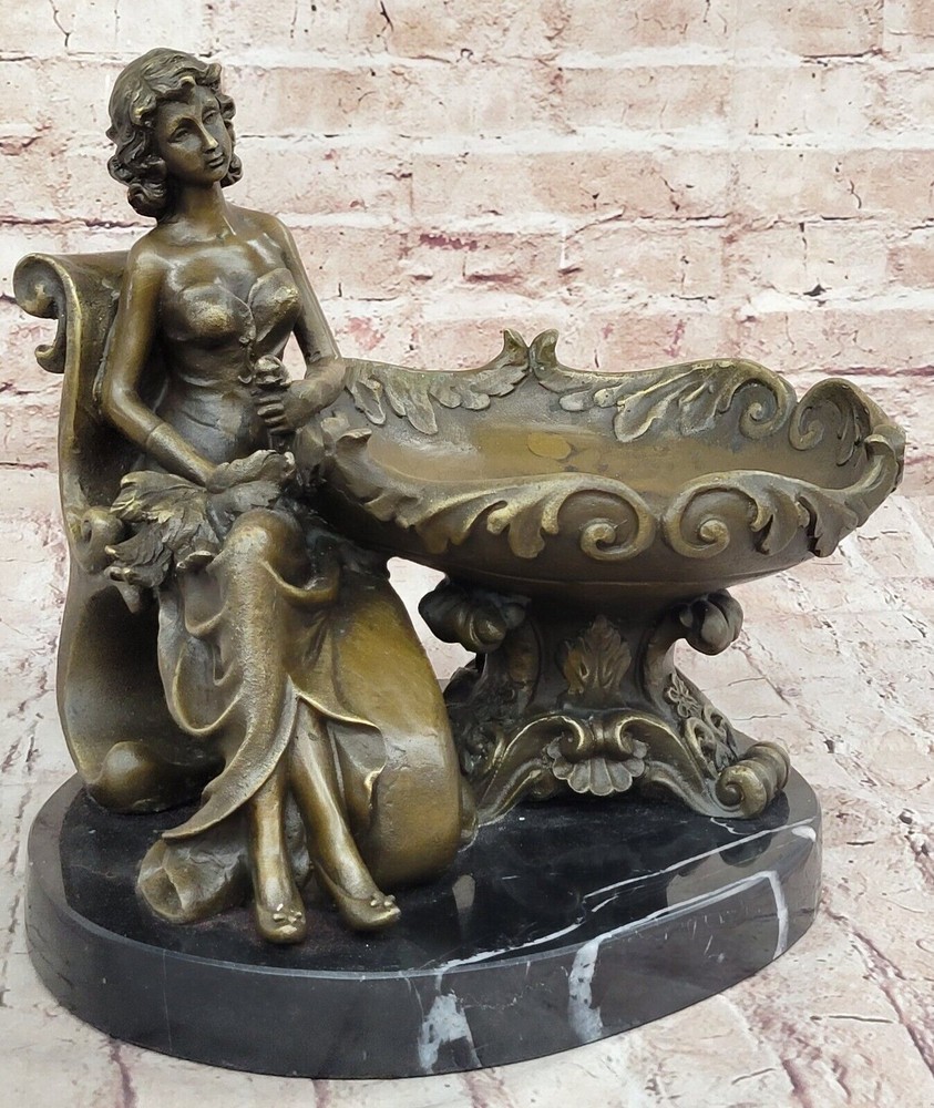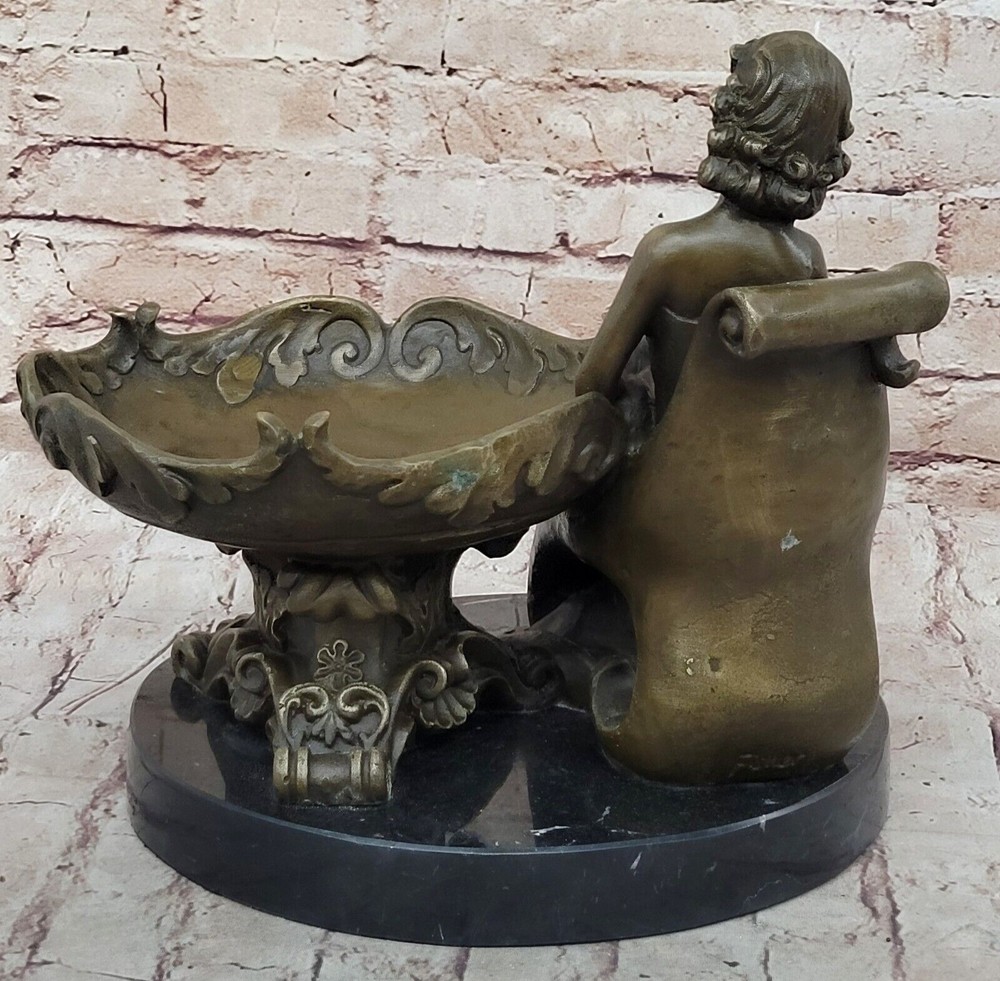 Figural Copper Bronze Signed Fisher Lost Wax Jewelry Receiver Tray Dish Artwork Figural Copper Bronze Signed Fisher Lost Wax Jewelry Receiver Tray Dish Artwork Condition : This sculpture is in perfect condition. Bronze Dimensions with Marble Base: Height 11" X Width 12.5" Marble Dimensions: Diameter 10" Height without base:10" Weight:22 LBS Inventory:47YRD134113274 Charming Composition and Artistic Expression This captivating bronze sculpture beautifully showcases a young girl as the central figure in a delightful and artistic composition. Reclining with an air of relaxed elegance, she holds an oversized, stylish plate on her lap, with her flowing skirt cascading behind her in a graceful manner. The half-nude figure exudes a sense of natural beauty and innocence, while the intricate designs on the plate add an extra layer of visual intrigue to the piece. The artist has skillfully captured a moment of serene contemplation, making the sculpture a charming addition to any space. Expert Craftsmanship and Attention to Detail Crafted with exceptional precision using the revered "Lost Wax Method," this sculpture reflects the meticulous attention to detail that characterizes the work of master sculptors. From the delicate curves of the girl's form to the elaborate patterns adorning the plate, every element of the sculpture has been thoughtfully executed. The rich bronze finish, paired with the sleek black marble base, enhances the overall aesthetic, providing a striking contrast that highlights the sculpture's intricate details and enhances its visual appeal. A Unique and Collectible Piece of Art Signed by the artist Fisher, this sculpture not only stands as a testament to the artist's skill but also adds to its value as a collectible piece of art. Its distinctive design offers a fresh and unique perspective on traditional statuary, making it a standout addition to any collection. Whether displayed as a centerpiece in a home or as part of a larger art ensemble, this sculpture invites viewers to admire the fusion of creativity, craftsmanship, and elegance that it embodies, making it a cherished and admired piece in any setting. Art Noveau Decorative Business Card Holder Bronze Sculpture Figurine Deal www.bronzhaus.com Video will open in a new window Using the eBay App? Paste link into a browser window: [isdntekvideo] Shipping Terms : Most of our items are shipped via USPS (United States Postal Service) mail or UPS. Most orders are shipped within 24-48 hours of purchase. Please be aware that not all items are available for USPS shipping due to size and weight. We do ship to Hawaii, Alaska, Canada, Puerto Rico, APO/AE, and U.S. Virgin Islands, however, an additional charge may be required. Please contact us before making any purchases in these areas. For Non-USA customers, you may be responsible for all duty, tax, brokerage fees that may be due upon delivery (shipping costs cover freight charges only). We also ship internationally. Please refer to the "Shipping and Handling" chart for the rates for each area. Payment : We accept just about any form of payment. PayPal, Master Card, Visa or American Express credit cards. Money orders, cashiers checks, and even personal or business checks. For governmental institutions, we will also accept a purchase order. Please understand that for personal or business checks we have to wait for the check to clear (usually 7 days) before shipping. Condition : New Detailed Hand Crafted Hot Cast Bronze ~Not Resin~ Satisfaction Guaranteed. This is Stock Photo, Slight Color Variation!! Listing and template services provided by inkFrog
