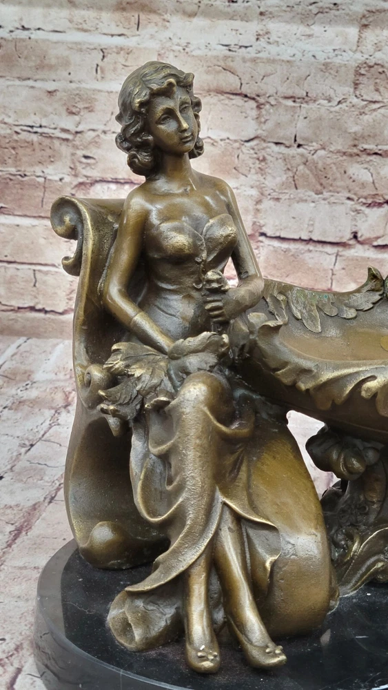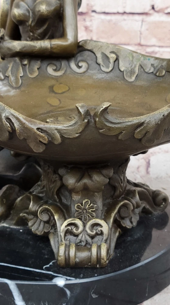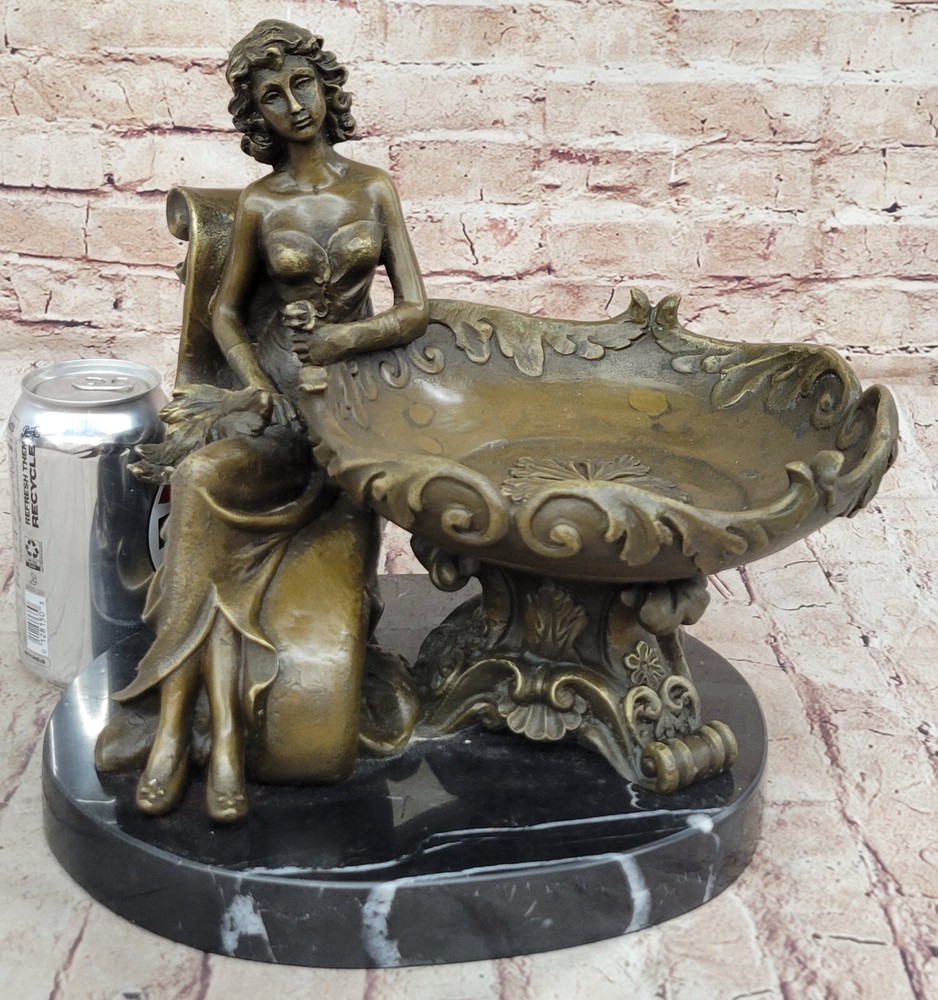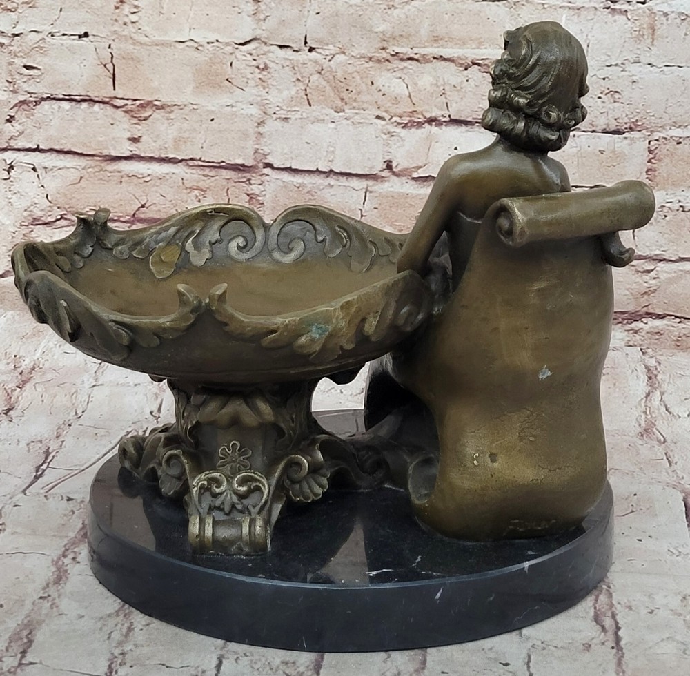 Figural Copper Bronze Signed Fisher Lost Wax Jewelry Receiver Tray Dish Figural Copper Bronze Signed Fisher Lost Wax Jewelry Receiver Tray Dish Condition : This sculpture is in perfect condition. Bronze Dimensions with Marble Base: Height 11" X Width 12.5" Marble Dimensions: Diameter 10" Height without base:10" Weight:22 LBS Inventory:47YRD134113274 Charming Composition and Artistic Expression This captivating bronze sculpture beautifully showcases a young girl as the central figure in a delightful and artistic composition. Reclining with an air of relaxed elegance, she holds an oversized, stylish plate on her lap, with her flowing skirt cascading behind her in a graceful manner. The half-nude figure exudes a sense of natural beauty and innocence, while the intricate designs on the plate add an extra layer of visual intrigue to the piece. The artist has skillfully captured a moment of serene contemplation, making the sculpture a charming addition to any space. Expert Craftsmanship and Attention to Detail Crafted with exceptional precision using the revered "Lost Wax Method," this sculpture reflects the meticulous attention to detail that characterizes the work of master sculptors. From the delicate curves of the girl's form to the elaborate patterns adorning the plate, every element of the sculpture has been thoughtfully executed. The rich bronze finish, paired with the sleek black marble base, enhances the overall aesthetic, providing a striking contrast that highlights the sculpture's intricate details and enhances its visual appeal. A Unique and Collectible Piece of Art Signed by the artist Fisher, this sculpture not only stands as a testament to the artist's skill but also adds to its value as a collectible piece of art. Its distinctive design offers a fresh and unique perspective on traditional statuary, making it a standout addition to any collection. Whether displayed as a centerpiece in a home or as part of a larger art ensemble, this sculpture invites viewers to admire the fusion of creativity, craftsmanship, and elegance that it embodies, making it a cherished and admired piece in any setting. Art Noveau Decorative Business Card Holder Bronze Sculpture Figurine Deal www.bronzhaus.com Video will open in a new window Using the eBay App? Paste link into a browser window: [isdntekvideo] Shipping Terms : Most of our items are shipped via USPS (United States Postal Service) mail or UPS. Most orders are shipped within 24-48 hours of purchase. Please be aware that not all items are available for USPS shipping due to size and weight. We do ship to Hawaii, Alaska, Canada, Puerto Rico, APO/AE, and U.S. Virgin Islands, however, an additional charge may be required. Please contact us before making any purchases in these areas. For Non-USA customers, you may be responsible for all duty, tax, brokerage fees that may be due upon delivery (shipping costs cover freight charges only). We also ship internationally. Please refer to the "Shipping and Handling" chart for the rates for each area. Payment : We accept just about any form of payment. PayPal, Master Card, Visa or American Express credit cards. Money orders, cashiers checks, and even personal or business checks. For governmental institutions, we will also accept a purchase order. Please understand that for personal or business checks we have to wait for the check to clear (usually 7 days) before shipping. Condition : New Detailed Hand Crafted Hot Cast Bronze ~Not Resin~ Satisfaction Guaranteed. This is Stock Photo, Slight Color Variation!! Listing and template services provided by inkFrog