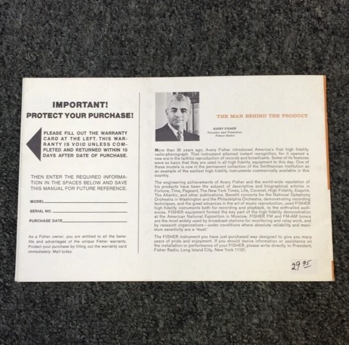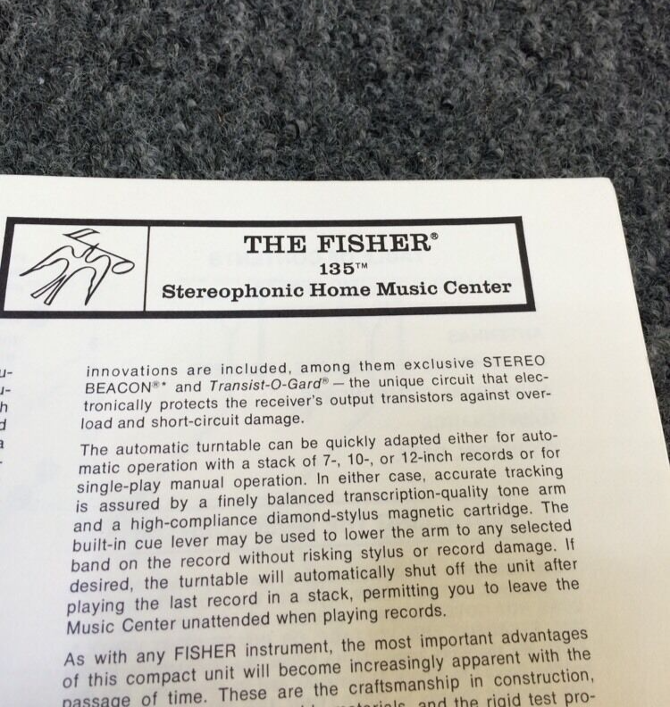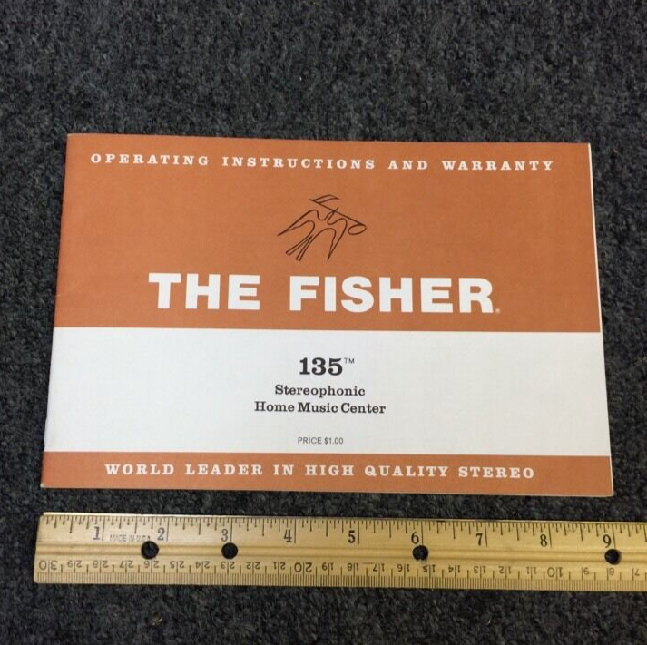 Fisher 135 Stereo Receiver Home Music Center Original Owners Manual Approx 15 Pages. Operating instructions and warrantee the fisher 135 Stereophonics home music center very good condition. Serial number on warranty card was filled in. That is the only writing in the whole book. There is a small price sticker on the back page. If you own this collectors component, you got to have this manual to make it complete. Thank you so much. Fred’s Sound Of Music Audio Video Since 1948