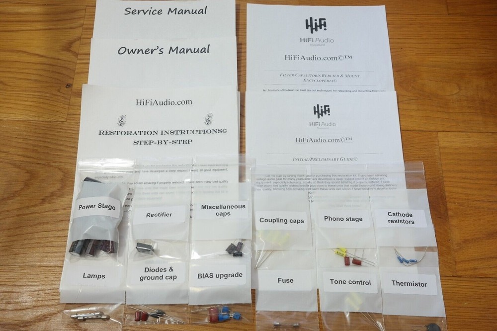 The scarcity of good, honest techs who can do good and reasonably priced restoration/rebuild of audio equipment inspired me to create this restoration kit. In today's day and age, it is difficult to find a knowledgeable technician who can service your audio gear properly. I have seen many poor quality restorations of equipment that cost way too much for their owners. In 99% of the cases, only a few parts were replaced, instead of a full and proper restoration job. A proper restoration must replace all electrolytic, paper, film, oil capacitors. Do not fall for partial kits. This is not a good or proper way to restore your audio equipment. It is the same as with car tires; one should never replace just one tire and keep the other worn-out tires on. A proper rebuild requires a full recap of all PCBs. On the other hand, if one succeeds in finding a good tech, the wait time is usually 6-12 months for the unit to be serviced, and costs are sky-high. I have been servicing audio equipment for many years and have developed deep respect for all good equipment. Knowing how amazing and warm these units can sound, I decided to put together this kit. It includes very good upgrades and improvements that must be done to the unit. This restoration kit will make a huge difference in the sound quality. All the parts are of high-quality Japanese Nichicon / Rubycon / WIMA / IC / United Chemi capacitors. I am extremely particular about the quality of the parts provided in this kit. Knowing how many bogus/fake caps, diodes, resistors, etc. are out there, I source all the parts from reputable wholesalers and buy them in bulk. Vintage audio equipment has the potential to deliver rich and authentic sound when it is properly restored. Not only can it enhance your listening experience, but it can also evoke memories and bring joy to your life. Let's work together to bring your vintage gear back to its full potential, and make sure you have the music you deserve. ♩♬♫♪♫♩♬ “They Shall Have Music”- Avery Fisher Included in this kit: 1. Power/Filter stage capacitors ( Nichicon / Nippon / United Chemi) electrolytic capacitors. Note, the image with silver multicap cans shown restaffed with new caps is for illustration purpose only. 2. Detailed instruction with colorful images, schematics, manuals (all of these are in electronic form, I consider these much better than printed version due to zoom availability). 3. Schematics (all of these are in electronic form, I consider these much better than printed version due to zoom availability). 4. Complete audio path upgrade with high quality WIMA or IC (Illinois capacitor) film capacitors. 5. Parts for compete recap of all the electrolytic capacitors. 6. Complete recap of all oil, film, paper, lytic caps. 7. fuse/s 8. Instructions on how to clean the chassis. 9. Instructions on how to clean a faceplate 10. Instructions on how to polish knob covers. 11. Support/help to a reasonable extend in case you need it. (This is what makes us different from other sellers.) We also offer a great selection of Restoration Kits , LED conversion kits , Volume Controls , Rotary Switches and other rare/unique parts; Make sure to check our store ---------> LINK (Use the search bar inside the shop to find what you need faster) We may also be interested in purchasing your equipment