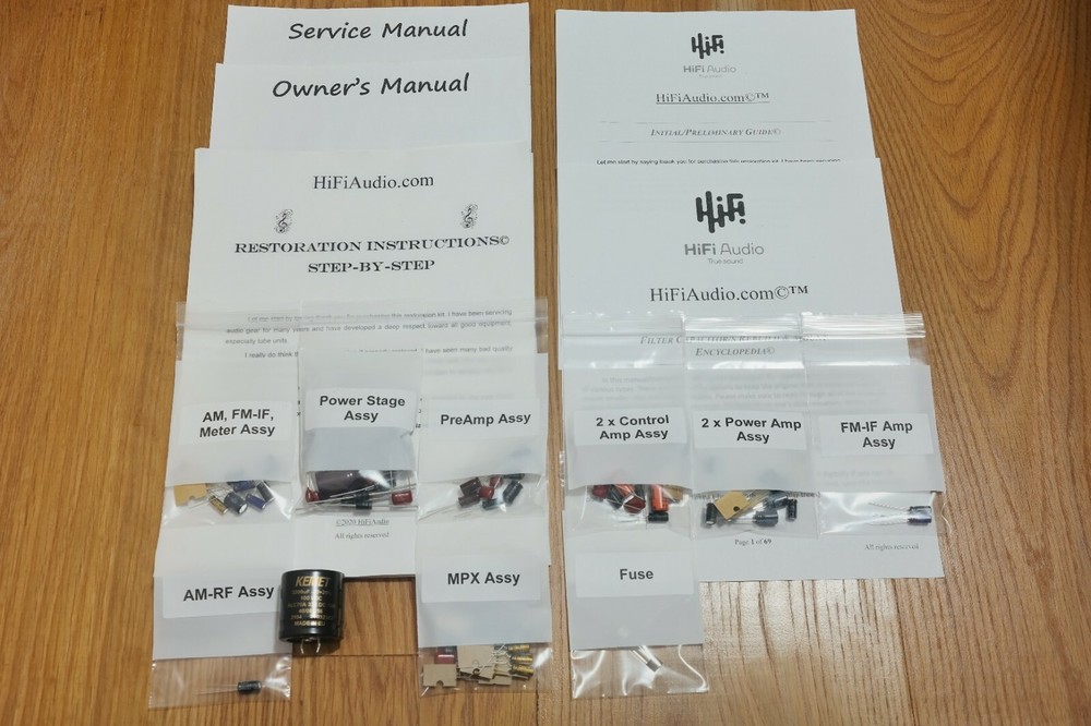 The scarcity of good, honest techs who can do good and reasonably priced restoration/rebuild of audio equipment inspired me to create this restoration kit. In today's day and age, it is difficult to find a knowledgeable technician who can service your audio gear properly. I have seen many poor quality restorations of equipment that cost way too much for their owners. In 99% of the cases, only a few parts were replaced, instead of a full and proper restoration job. A proper restoration must replace all electrolytic capacitors on all boards. Do not fall for partial kits that restore just one PCB (power supply, power amp, etc.). This is not a good or proper way to restore your audio equipment. It is the same as with car tires; one should never replace just one tire and keep the other worn-out tires on. A proper rebuild requires a full recap of all PCBs. On the other hand, if one succeeds in finding a good tech, the wait time is usually 6-12 months for the unit to be serviced, and costs are sky-high. I have been servicing audio equipment for many years and have developed deep respect for all good equipment. Knowing how amazing and warm these units can sound, I decided to put together this kit. It includes very good upgrades and improvements that must be done to the unit. This restoration kit will make a huge difference in the sound quality. All the parts are of high-quality Japanese Nichicon / Rubycon / WIMA / IC / United Chemi capacitors. I am extremely particular about the quality of the parts provided in this kit. Knowing how many bogus/fake caps, diodes, resistors, etc. are out there, I source all the parts from reputable wholesalers and buy them in bulk. Vintage audio equipment has the potential to deliver rich and authentic sound when it is properly restored. Not only can it enhance your listening experience, but it can also evoke memories and bring joy to your life. Let's work together to bring your vintage gear back to its full potential, and make sure you have the music you deserve. ♩♬♫♪♫♩♬ “They Shall Have Music”- Avery Fisher Included in this kit: 1. Power/Filter stage capacitors ( Nichicon / Nippon / United Chemi) electrolytic capacitors. 2. Detailed instruction with colorful images, schematics, manuals (all of these are in electronic form, I consider these much better than printed version due to zoom availability). 3. Schematics 4. Complete audio path upgrade with high quality WIMA or IC (Illinois capacitor) film capacitors. 5. Parts for compete recap of all the electrolytic capacitors. 6. Complete recap of all PCBs. 7. Transistors (PNP, NPN). 8. fuse/s 9. Instructions on how to clean the chassis. 10. Instructions on how to clean a faceplate 11. Instructions on how to polish knob covers. 12. Support/help to a reasonable extend in case you need it. (This is what makes us different from other sellers.) We also offer a great selection of Restoration Kits , LED conversion kits , Volume Controls , Rotary Switches and other rare/unique parts; Make sure to check our store ---------> LINK (Use the search bar inside the shop to find what you need faster) We may also be interested in purchasing your equipment