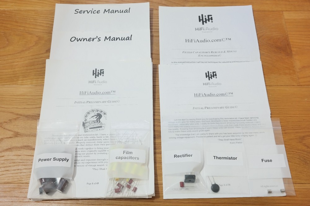 The scarcity of good, honest techs who can do good and reasonably priced restoration/rebuild of audio equipment inspired me to create this restoration kit. In today's day and age, it is difficult to find a knowledgeable technician who can service your audio gear properly. I have seen many poor quality restorations of equipment that cost way too much for their owners. In 99% of the cases, only a few parts were replaced, instead of a full and proper restoration job. A proper restoration must replace all electrolytic capacitors on all boards. Do not fall for partial kits that restore just one PCB (power supply, power amp, etc.). This is not a good or proper way to restore your audio equipment. It is the same as with car tires; one should never replace just one tire and keep the other worn-out tires on. A proper rebuild requires a full recap of all PCBs. On the other hand, if one succeeds in finding a good tech, the wait time is usually 6-12 months for the unit to be serviced, and costs are sky-high. I have been servicing audio equipment for many years and have developed deep respect for all good equipment. Knowing how amazing and warm these units can sound, I decided to put together this kit. It includes very good upgrades and improvements that must be done to the unit. This restoration kit will make a huge difference in the sound quality. All the parts are of high-quality Japanese Nichicon / Rubycon / WIMA / IC / United Chemi capacitors. I am extremely particular about the quality of the parts provided in this kit. Knowing how many bogus/fake caps, diodes, resistors, etc. are out there, I source all the parts from reputable wholesalers and buy them in bulk. Vintage audio equipment has the potential to deliver rich and authentic sound when it is properly restored. Not only can it enhance your listening experience, but it can also evoke memories and bring joy to your life. Let's work together to bring your vintage gear back to its full potential, and make sure you have the music you deserve. ♩♬♫♪♫♩♬ “They Shall Have Music”- Avery Fisher Included in this kit: 1. Power/Filter stage upgrade with authentic Nichicon / Nippon / WIMA / IC / United Chemi electrolytic capacitors. 2. Detailed instruction with colorful images, schematics, manuals (all of these are in electronic form, I consider these much better than printed version due to zoom availability). 3. Schematics 4. Complete audio path upgrade with high quality WIMA or IC (Illinois capacitor) film capacitors. 5. Parts for compete recap of all the electrolytic capacitors. 6. Complete recap of all oil, film , paper, lytic caps. 7. Diodes. 8. Inrush thermistor (to limit the initial current inflow). 9. Bridge rectifier. 11. LED dial and indicator bulbs 12. 1 x main fuse 13. Instructions on how to clean the chassis and the glass. 14. Instructions on how to clean a faceplate 15. Instructions on how to polish knob covers. 16. Support/help to a reasonable extend in case you need it. (This is what makes us different from other sellers.) -------- Also available NEW production volume control -----------> LINK We may also be interested in purchasing your equipment.