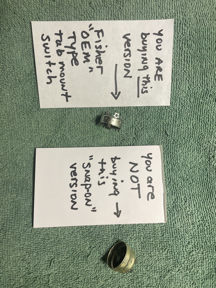 NEW LOWER PRICE !!!! Get these before they are gone.... they are in limited supply. Original OEM (original equipment manufacturer) type 4 lug AC power switch. This version has tabs that attaches to the rear housing of the volume control of Fisher 400, 500 and 800 series tube type Am-FM receivers. You must remove and disassemble the control to install this version of switch. Please note there is another version that removes easily, this is NOT THAT VERSION . Be SURE to look carefully at the pictures to see this version. This part is NOS and has never been used. We sell and repair most any control 1930-1970 era. Antique Audio Plymouth , Michigan. We’ll be at the Vintage Electronics Expo / Kalamazoo Hamfest Saturday, Oct 4 2025 9am-4pm. Google Kalamazoo Hamfest for info