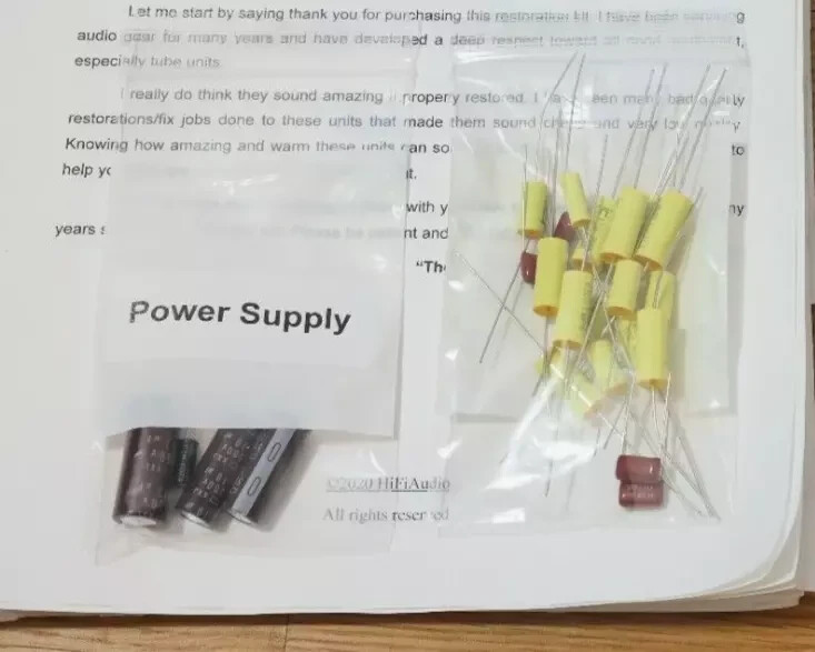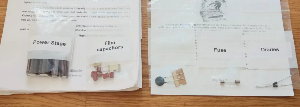 NOTE we also offer FULL kit with BETTER quality caps, BIAS upgrade & INSTRUCTIONS -----------> LINK Or search for item ( eBay item number: 155126516025 ) The scarcity of good, honest techs who can do good and reasonably priced restoration/rebuild of audio equipment inspired me to create this restoration kit. In today's day and age, it is difficult to find a knowledgeable technician who can service your audio gear properly. I have seen many poor quality restorations of equipment that cost way too much for their owners. In 99% of the cases, only a few parts were replaced, instead of a full and proper restoration job. A proper restoration must replace all electrolytic capacitors on all boards. Do not fall for partial kits that restore just one PCB (power supply, power amp, etc.). This is not a good or proper way to restore your audio equipment. It is the same as with car tires; one should never replace just one tire and keep the other worn-out tires on. A proper rebuild requires a full recap of all PCBs. On the other hand, if one succeeds in finding a good tech, the wait time is usually 6-12 months for the unit to be serviced, and costs are sky-high. I have been servicing audio equipment for many years and have developed deep respect for all good equipment. Knowing how amazing and warm these units can sound, I decided to put together this kit. It includes very good upgrades and improvements that must be done to the unit. This restoration kit will make a huge difference in the sound quality. All the parts are of high-quality Japanese Nichicon / Rubycon / WIMA / IC / United Chemi capacitors. I am extremely particular about the quality of the parts provided in this kit. Knowing how many bogus/fake caps, diodes, resistors, etc. are out there, I source all the parts from reputable wholesalers and buy them in bulk. Vintage audio equipment has the potential to deliver rich and authentic sound when it is properly restored. Not only can it enhance your listening experience, but it can also evoke memories and bring joy to your life. Let's work together to bring your vintage gear back to its full potential, and make sure you have the music you deserve. ♩♬♫♪♫♩♬ “They Shall Have Music”- Avery Fisher Included in this kit: 1. Power/Filter stage capacitors ( Nichicon / Panasonic / United Chemi) electrolytic capacitors. 2. Complete audio path upgrade with high quality US made (IC) or Panasonic audio grade film capacitors. 3. Parts for compete recap of all the electrolytic capacitors. 4. fuse/s 5. Diodes Please note this kit does not come with any instructions. If you need instructions, see the link below for a full kit. Also Bias upgrade to individual output tube is not included in this kit. FULL kit with BETTER quality caps & INSTRUCTIONS -----------> LINK We also offer a great selection of Restoration Kits , LED conversion kits , Volume Controls , Rotary Switches and other rare/unique parts; Make sure to check our store ---------> LINK (Use the search bar inside the shop to find what you need faster) We may also be interested in purchasing your equipment