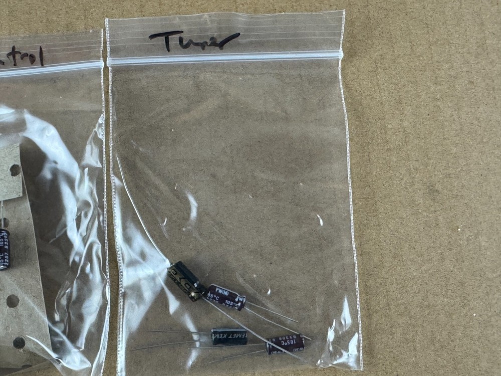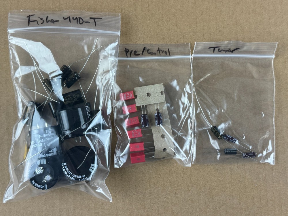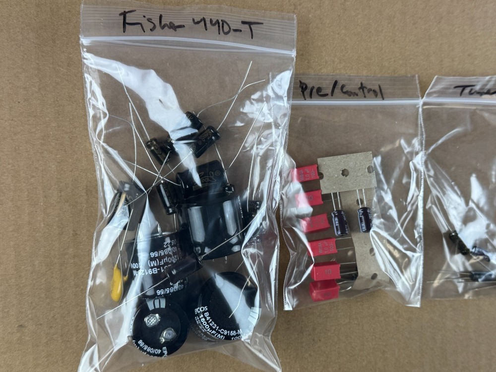 Up for sale here is this rebuild kit for the Fisher 440T. This includes replacements for all electrolytic and tantalum capacitors in the Fisher 440T receiver. New capacitors are Epcos, Nichicon PW, Nichicon KL, Wima film, Kemet, and Supertech axial caps. These are all high-quality brand new genuine parts, the same parts I use when I work on vintage stereo gear. New caps are the same or very close capacitance, and the same or higher voltage ratings. The kit includes new axial capacitors to replace the old axial caps, and new radial caps to replace the radials. The 1500 uf can capacitors on top are replaced with new 1500 uf 100v Epcos snap-in caps--you can remove the old caps and epoxy the new ones to the top. I will include surprisingly well-written instructions, but this is moderately complicated, and you should know what you're doing and have a decent soldering iron and a dim-bulb tester with a 40W, 60W, or 100W incandescent bulb. This kit may not fix your receiver, but it's pretty likely that it will, and it will definitely help it run better. US shipping and handling is $5, and international is $18. If you have any questions, please ask. Looking for more parts? I have power switches , feet , pushbuttons , top case screws , bottom screws , faceplate screws , white LED fuse lamps , blue LED fuse lamps , 6.3v bi-pin bulbs , 8v bi-pin bulbs , 12v bi-pin bulbs , wired 8v 60ma bulbs , new power cords , new main capacitors for the Marantz 1060/2230 , wired Pioneer speaker plug replacements , new 630v yellow film capacitors at 13 different values , a large variety of transistors for vintage stereo repair, and more. Just use "add to cart" on everything you want and then check out for combined shipping.