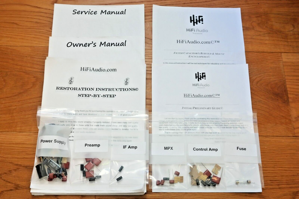 The scarcity of good, honest techs who can do good and reasonably priced restoration/rebuild of audio equipment inspired me to create this restoration kit. In today's day and age, it is difficult to find a knowledgeable technician who can service your audio gear properly. I have seen many poor quality restorations of equipment that cost way too much for their owners. In 99% of the cases, only a few parts were replaced, instead of a full and proper restoration job. A proper restoration must replace all electrolytic capacitors on all boards. Do not fall for partial kits that restore just one PCB (power supply, power amp, etc.). This is not a good or proper way to restore your audio equipment. It is the same as with car tires; one should never replace just one tire and keep the other worn-out tires on. A proper rebuild requires a full recap of all PCBs. On the other hand, if one succeeds in finding a good tech, the wait time is usually 6-12 months for the unit to be serviced, and costs are sky-high. I have been servicing audio equipment for many years and have developed deep respect for all good equipment. Knowing how amazing and warm these units can sound, I decided to put together this kit. It includes very good upgrades and improvements that must be done to the unit. This restoration kit will make a huge difference in the sound quality. All the parts are of high-quality Japanese Nichicon / Rubycon / WIMA / IC / United Chemi capacitors. I am extremely particular about the quality of the parts provided in this kit. Knowing how many bogus/fake caps, diodes, resistors, etc. are out there, I source all the parts from reputable wholesalers and buy them in bulk. Vintage audio equipment has the potential to deliver rich and authentic sound when it is properly restored. Not only can it enhance your listening experience, but it can also evoke memories and bring joy to your life. Let's work together to bring your vintage gear back to its full potential, and make sure you have the music you deserve. ♩♬♫♪♫♩♬ “They Shall Have Music”- Avery Fisher Included in this kit: 1. Power/Filter stage capacitors ( Nichicon / Nippon / United Chemi) electrolytic capacitors. 2. Detailed instruction with colorful images, schematics, manuals (all of these are in electronic form, I consider these much better than printed version due to zoom availability). 3. Schematics 4. Complete audio path upgrade with high quality WIMA or IC (Illinois capacitor) film capacitors. 5. Parts for compete recap of all the electrolytic capacitors. 6. Complete recap of all PCBs. 7. Transistors (PNP, NPN). 8. fuse/s 9. Instructions on how to clean the chassis. 10. Instructions on how to clean a faceplate 11. Instructions on how to polish knob covers. 12. Support/help to a reasonable extend in case you need it. (This is what makes us different from other sellers.) We also offer a great selection of Restoration Kits , LED conversion kits , Volume Controls , Rotary Switches and other rare/unique parts; Make sure to check our store ---------> LINK (Use the search bar inside the shop to find what you need faster) We may also be interested in purchasing your equipment