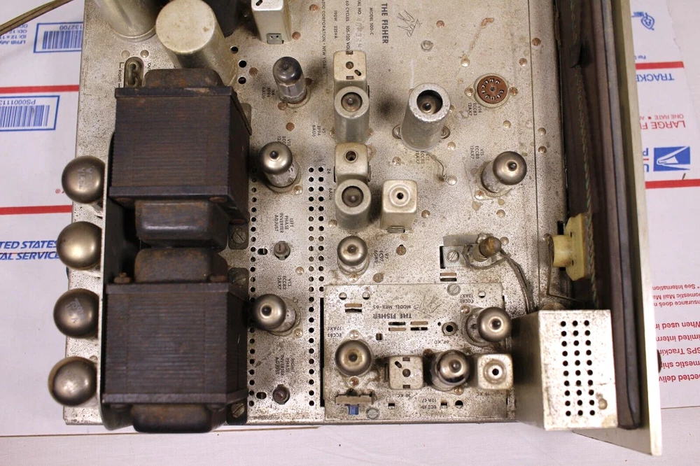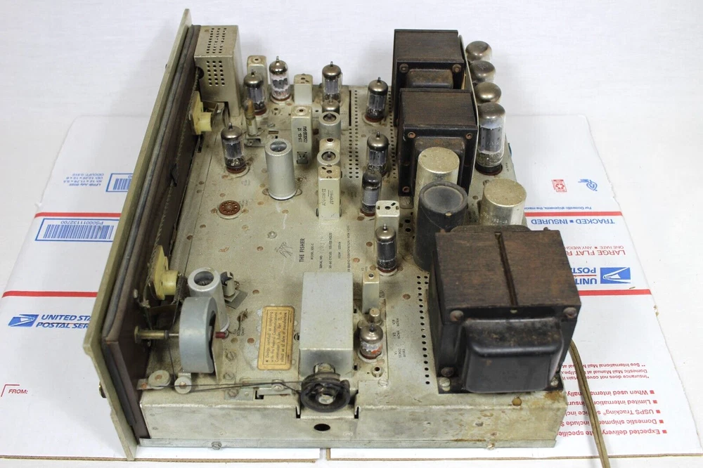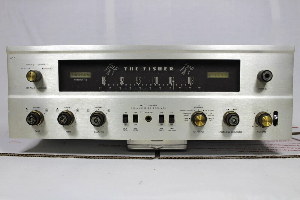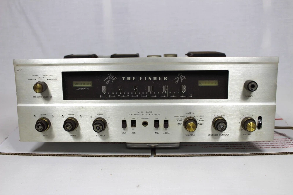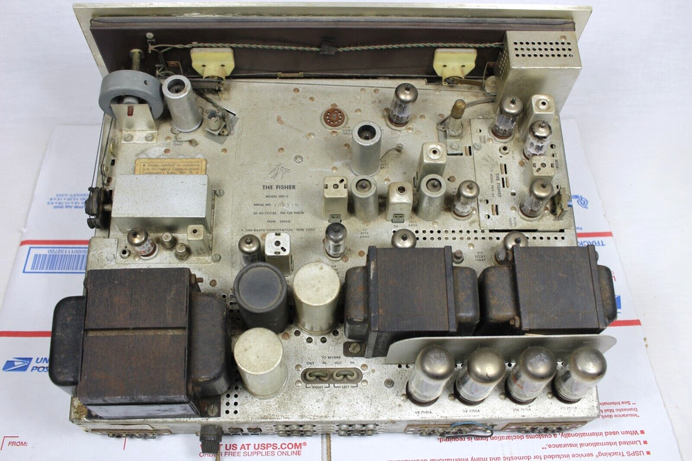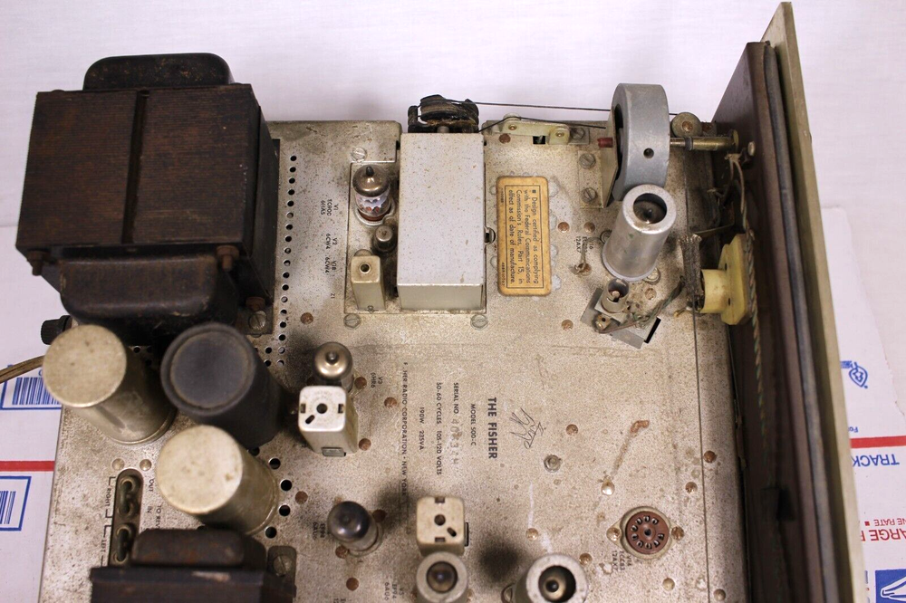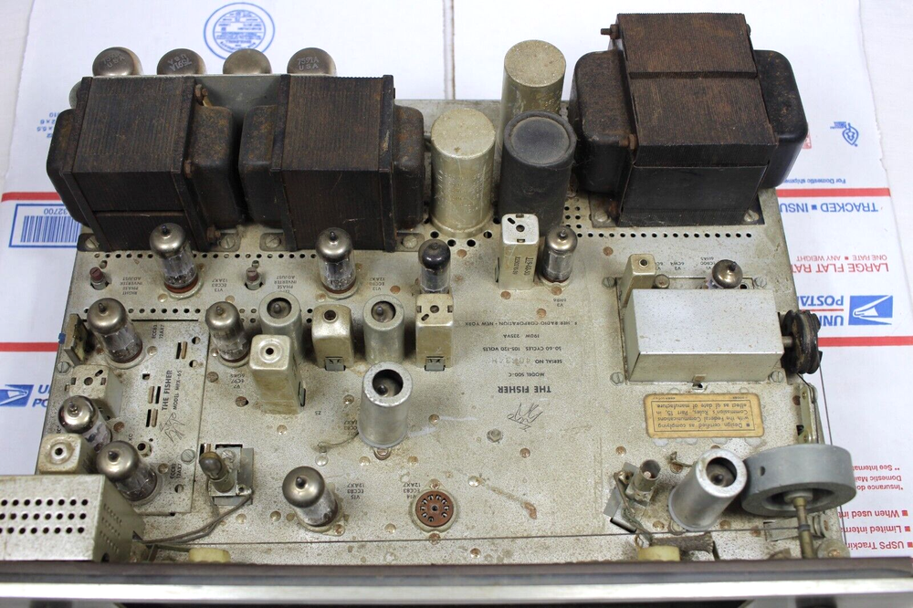 UP FOR SALE NOT WORKING Fisher 500-C Stereo Tube Receiver AS-IS For Parts or Repair Only THIS ITEM DOES NOT POWER ON AT ALL IT IS TOTALLY DEAD. THIS ITEM IS BEING SOLD AS-IS: NO RETURNS OR REFUNDS ACCEPTED THIS IS A FINAL SALE. IF YOU DO NOT AGREE WITH THE TERMS AND CONDITION OF THIS ITEM PLEASE DO NOT PURCHASE OR MAKE AN OFFER ON IT. I PLUGGED IT IN AND I DID NOT SEE ANY SIGNS OF LIGHTS IN ANY TUBES AT ALL. THATS ALL I CAN TELL ABOUT THIS UNIT. I DID NOTICE THAT THERE IS A KILL "SWITCH" OR A "ON & OFF SWITCH" ON THE RIGHT SIDE OF THE UNIT NEAR THE VOLUME KNOB, I DO NOT KNOW WHAT IT’S PURPOSE IS, SOMEBODY MADE THAT SWITCH BECAUSE I HAD ONE AND SOLD IT AND IT DID NOT HAVE THAT SWITCH ON THE RIGHT SIDE OF THE UNIT. ONCE AGAIN I DO NOT HAVE ANY CLUE WHY SOMEBODY MADE THE SWITCH OR IT'S PURPOSE. ALSO IT'S MISSING TWO TUBES and I DO NOT KNOW IF THE REST OF THE TUBES ARE GOOD OR NOT. THE "LOW FILTER" SWITCH IS BROKEN. FIVE GOLD CAPS ARE MISSING FROM THE SWITCHES AS PICTURED. THE INTERIOR IS VERY DUSTY AS PICTURED. THIS RECEIVER DOES NOT HAVE A LID/TOP OR CABINET. NO CABINET . THE CONDITION THAT IS PICTURED IS THE CONDITION THAT YOU WILL RECEIVE THIS ITEM IN. TO BE SAFE WHEN I WILL SHIP THIS UNIT I WILL REMOVE ALL THE TUBES AND I WILL PACK AND SHIP THE TUBES IN A SEPARATE BOX FOR FREE TROUGH USPS. NOT WITH THE STEREO. I DID SEE THAT SOME TUBES HAVE BEND PINS. IF YOU ANY QUESTIONS ABOUT THIS ITEM OR NEED ADDITIONAL PICTURES PLEASE FEEL FREE TO CONTACT ME ANYTIME. WHAT IS PICTURED IS EXACTLY WHAT YOU WILL RECEIVE. THANK YOU VERY MUCH FOR LOOKING AT THIS ITEM.