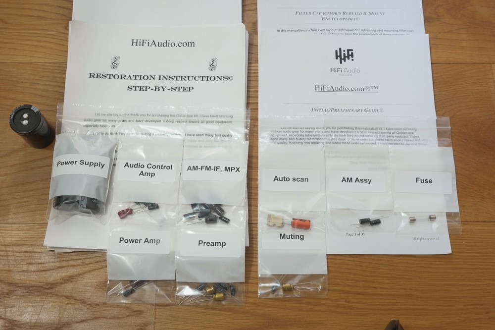 The scarcity of good, honest techs who can do good and reasonably priced restoration/rebuild of audio equipment inspired me to create this restoration kit. In today's day and age, it is difficult to find a knowledgeable technician who can service your audio gear properly. I have seen many poor quality restorations of equipment that cost way too much for their owners. In 99% of the cases, only a few parts were replaced, instead of a full and proper restoration job. A proper restoration must replace all electrolytic, paper, film, oil capacitors. Do not fall for partial kits. This is not a good or proper way to restore your audio equipment. It is the same as with car tires; one should never replace just one tire and keep the other worn-out tires on. A proper rebuild requires a full recap of all oil, paper, lytic capacitors. On the other hand, if one succeeds in finding a good tech, the wait time is usually 6-12 months for the unit to be serviced, and costs are sky-high. I have been servicing audio equipment for many years and have developed deep respect for all good equipment. Knowing how amazing and warm these units can sound, I decided to put together this kit. It includes very good upgrades and improvements that must be done to the unit. This restoration kit will make a huge difference in the sound quality. All the parts are of high-quality Japanese Nichicon / Rubycon / WIMA / IC / United Chemi capacitors. I am extremely particular about the quality of the parts provided in this kit. Knowing how many bogus/fake caps, diodes, resistors, etc. are out there, I source all the parts from reputable wholesalers and buy them in bulk. Vintage audio equipment has the potential to deliver rich and authentic sound when it is properly restored. Not only can it enhance your listening experience, but it can also evoke memories and bring joy to your life. Let's work together to bring your vintage gear back to its full potential, and make sure you have the music you deserve. ♩♬♫♪♫♩♬ “They Shall Have Music”- Avery Fisher Included in this kit: 1. Power/Filter stage capacitors ( Nichicon / Nippon / United Chemi) electrolytic capacitors. 2. Detailed instruction with colorful images, schematics, manuals (all of these are in electronic form, I consider these much better than printed version due to zoom availability). 3. Schematics (all of these are in electronic form, I consider these much better than printed version due to zoom availability). 4. Complete audio path upgrade with high quality WIMA or IC (Illinois capacitor) film capacitors. 5. Parts for complete recap of all the electrolytic capacitors. 6. Complete recap of all oil, film, paper, lytic caps. 7. fuse/s 8. Instructions on how to clean the chassis. 9. Instructions on how to clean a faceplate 10. Instructions on how to polish knob covers. 11. Support/help to a reasonable extent in case you need it. (This is what makes us different from other sellers.) We also offer a great selection of Restoration Kits , LED conversion kits , Volume Controls , Rotary Switches and other rare/unique parts; Make sure to check our store ---------> LINK (Use the search bar inside the shop to find what you need faster) We may also be interested in purchasing your equipment