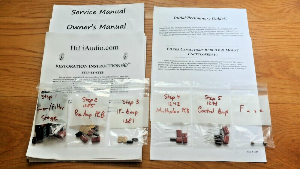 The scarcity of good, honest techs who can do good and reasonably priced restoration/rebuild of audio equipment inspired me to create this restoration kit. In today's day and age, it is difficult to find a knowledgeable technician who can service your audio gear properly. I have seen many poor quality restorations of equipment that cost way too much for their owners. In 99% of the cases, only a few parts were replaced, instead of a full and proper restoration job. A proper restoration must replace all electrolytic capacitors on all boards. Do not fall for partial kits that restore just one PCB (power supply, power amp, etc.). This is not a good or proper way to restore your audio equipment. It is the same as with car tires; one should never replace just one tire and keep the other worn-out tires on. A proper rebuild requires a full recap of all PCBs. On the other hand, if one succeeds in finding a good tech, the wait time is usually 6-12 months for the unit to be serviced, and costs are sky-high. I have been servicing audio equipment for many years and have developed deep respect for all good equipment. Knowing how amazing and warm these units can sound, I decided to put together this kit. It includes very good upgrades and improvements that must be done to the unit. This restoration kit will make a huge difference in the sound quality. All the parts are of high-quality Japanese Nichicon / Rubycon / WIMA / IC / United Chemi capacitors. I am extremely particular about the quality of the parts provided in this kit. Knowing how many bogus/fake caps, diodes, resistors, etc. are out there, I source all the parts from reputable wholesalers and buy them in bulk. Vintage audio equipment has the potential to deliver rich and authentic sound when it is properly restored. Not only can it enhance your listening experience, but it can also evoke memories and bring joy to your life. Let's work together to bring your vintage gear back to its full potential, and make sure you have the music you deserve. ♩♬♫♪♫♩♬ “They Shall Have Music”- Avery Fisher Included in this kit: 1. Power/Filter stage capacitors ( Nichicon / Nippon / United Chemi) electrolytic capacitors. 2. Detailed instruction with colorful images, schematics, manuals (all of these are in electronic form, I consider these much better than printed version due to zoom availability). 3. Schematics 4. Complete audio path upgrade with high quality WIMA or IC (Illinois capacitor) film capacitors. 5. Parts for compete recap of all the electrolytic capacitors. 6. Complete recap of all PCBs. 7. Transistors (PNP, NPN). 8. fuse/s 9. Instructions on how to clean the chassis. 10. Instructions on how to clean a faceplate 11. Instructions on how to polish knob covers. 12. Support/help to a reasonable extend in case you need it. (This is what makes us different from other sellers.) We also offer a great selection of Restoration Kits , LED conversion kits , Volume Controls , Rotary Switches and other rare/unique parts; Make sure to check our store ---------> LINK (Use the search bar inside the shop to find what you need faster) We may also be interested in purchasing your equipment
