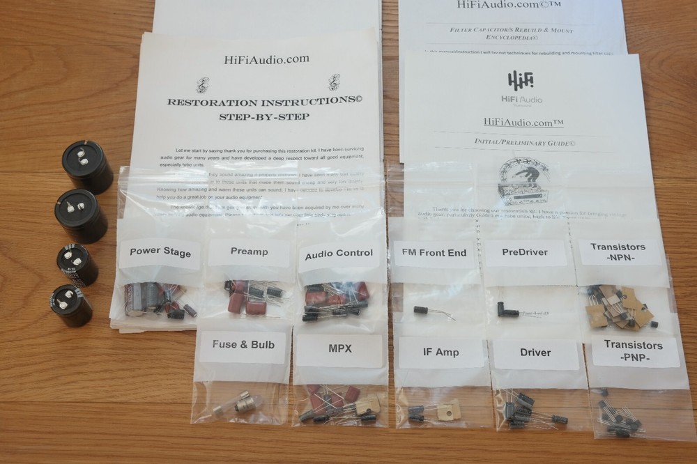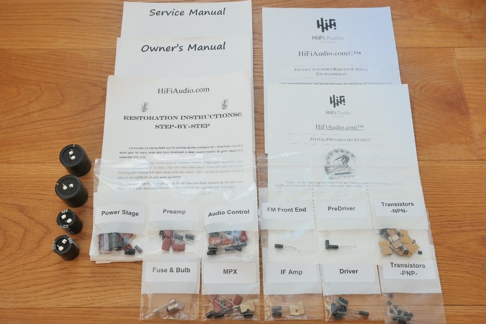 The scarcity of good, honest techs who can do good and reasonably priced restoration/rebuild of audio equipment inspired me to create this restoration kit. In today's day and age, it is difficult to find a knowledgeable technician who can service your audio gear properly. I have seen many poor quality restorations of equipment that cost way too much for their owners. In 99% of the cases, only a few parts were replaced, instead of a full and proper restoration job. A proper restoration must replace all electrolytic capacitors on all boards. Do not fall for partial kits that restore just one PCB (power supply, power amp, etc.). This is not a good or proper way to restore your audio equipment. It is the same as with car tires; one should never replace just one tire and keep the other worn-out tires on. A proper rebuild requires a full recap of all PCBs. On the other hand, if one succeeds in finding a good tech, the wait time is usually 6-12 months for the unit to be serviced, and costs are sky-high. I have been servicing audio equipment for many years and have developed deep respect for all good equipment. Knowing how amazing and warm these units can sound, I decided to put together this kit. It includes very good upgrades and improvements that must be done to the unit. This restoration kit will make a huge difference in the sound quality. All the parts are of high-quality Japanese Nichicon / Rubycon / WIMA / IC / United Chemi capacitors. I am extremely particular about the quality of the parts provided in this kit. Knowing how many bogus/fake caps, diodes, resistors, etc. are out there, I source all the parts from reputable wholesalers and buy them in bulk. Vintage audio equipment has the potential to deliver rich and authentic sound when it is properly restored. Not only can it enhance your listening experience, but it can also evoke memories and bring joy to your life. Let's work together to bring your vintage gear back to its full potential, and make sure you have the music you deserve. ♩♬♫♪♫♩♬ “They Shall Have Music”- Avery Fisher Included in this kit: 1. Power/Filter stage capacitors ( Nichicon / Nippon / United Chemi) electrolytic capacitors. 2. Detailed instruction with colorful images, schematics, manuals (all of these are in electronic form, I consider these much better than printed version due to zoom availability). 3. Schematics 4. Complete audio path upgrade with high quality WIMA or IC (Illinois capacitor) film capacitors. 5. Parts for compete recap of all the electrolytic capacitors. 6. Complete recap of all PCBs. 7. Transistors (PNP, NPN). 8. fuse/s 9. Instructions on how to clean the chassis. 10. Instructions on how to clean a faceplate 11. Instructions on how to polish knob covers. 12. Support/help to a reasonable extend in case you need it. (This is what makes us different from other sellers.) We also offer a great selection of Restoration Kits , LED conversion kits , Volume Controls , Rotary Switches and other rare/unique parts; Make sure to check our store ---------> LINK (Use the search bar inside the shop to find what you need faster) We may also be interested in purchasing your equipment
