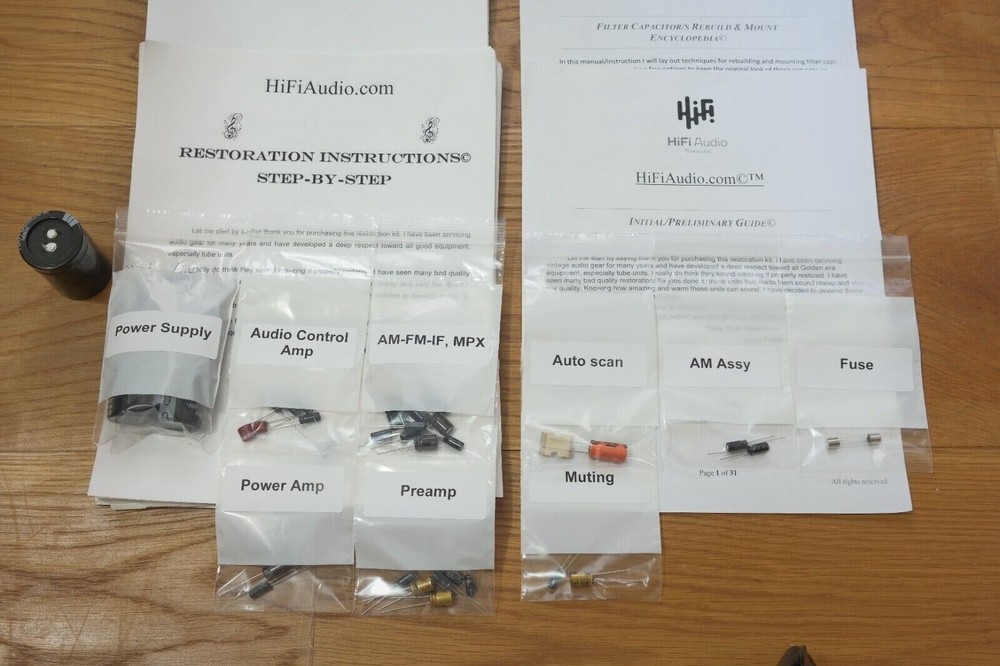 The scarcity of good, honest techs who can do good and reasonably priced restoration/rebuild of audio equipment inspired me to create this restoration kit. In today's day and age, it is difficult to find a knowledgeable technician who can service your audio gear properly. I have seen many poor quality restorations of equipment that cost way too much for their owners. In 99% of the cases, only a few parts were replaced, instead of a full and proper restoration job. A proper restoration must replace all electrolytic capacitors on all boards. Do not fall for partial kits that restore just one PCB (power supply, power amp, etc.). This is not a good or proper way to restore your audio equipment. It is the same as with car tires; one should never replace just one tire and keep the other worn-out tires on. A proper rebuild requires a full recap of all PCBs. On the other hand, if one succeeds in finding a good tech, the wait time is usually 6-12 months for the unit to be serviced, and costs are sky-high. I have been servicing audio equipment for many years and have developed deep respect for all good equipment. Knowing how amazing and warm these units can sound, I decided to put together this kit. It includes very good upgrades and improvements that must be done to the unit. This restoration kit will make a huge difference in the sound quality. All the parts are of high-quality Japanese Nichicon / Rubycon / IC / United Chemi capacitors. I am extremely particular about the quality of the parts provided in this kit. Knowing how many bogus/fake caps, diodes, resistors, etc. are out there, I source all the parts from reputable wholesalers and buy them in bulk. Vintage audio equipment has the potential to deliver rich and authentic sound when it is properly restored. Not only can it enhance your listening experience, but it can also evoke memories and bring joy to your life. Let's work together to bring your vintage gear back to its full potential, and make sure you have the music you deserve. ♩♬♫♪♫♩♬ “They Shall Have Music”- Avery Fisher Included in this kit: 1. Power/Filter stage capacitors ( Nichicon / Nippon / United Chemi) electrolytic capacitors. 2. Detailed instruction with colorful images, schematics, manuals (all of these are in electronic form, I consider these much better than printed version due to zoom availability). 3. Schematics 4. Complete audio path upgrade with high quality WIMA or IC (Illinois capacitor) film capacitors. 5. Parts for compete recap of all the electrolytic capacitors. 6. Complete recap of all PCBs. 7. Transistors (PNP, NPN). 8. fuse/s 9. Instructions on how to clean the chassis. 10. Instructions on how to clean a faceplate 11. Instructions on how to polish knob covers. 12. Support/help to a reasonable extend in case you need it. (This is what makes us different from other sellers.) We also offer a great selection of Restoration Kits , LED conversion kits , Volume Controls , Rotary Switches and other rare/unique parts; Make sure to check our store ---------> LINK (Use the search bar inside the shop to find what you need faster) We may also be interested in purchasing your equipment