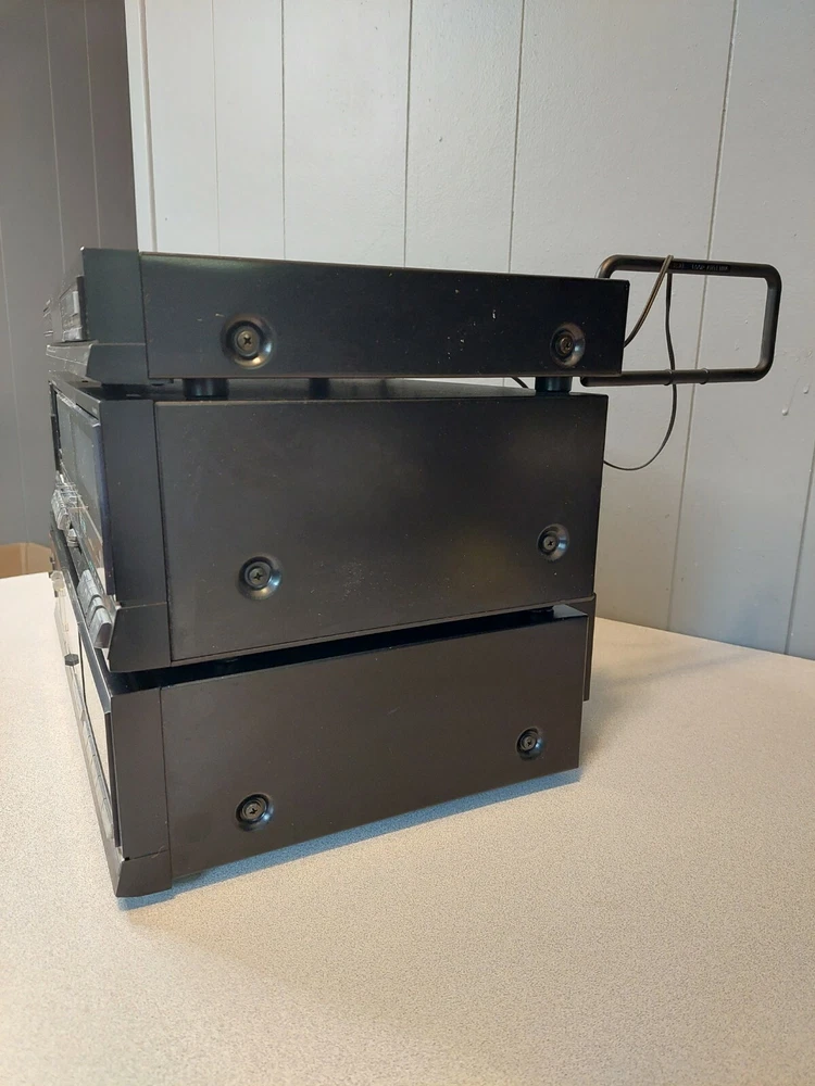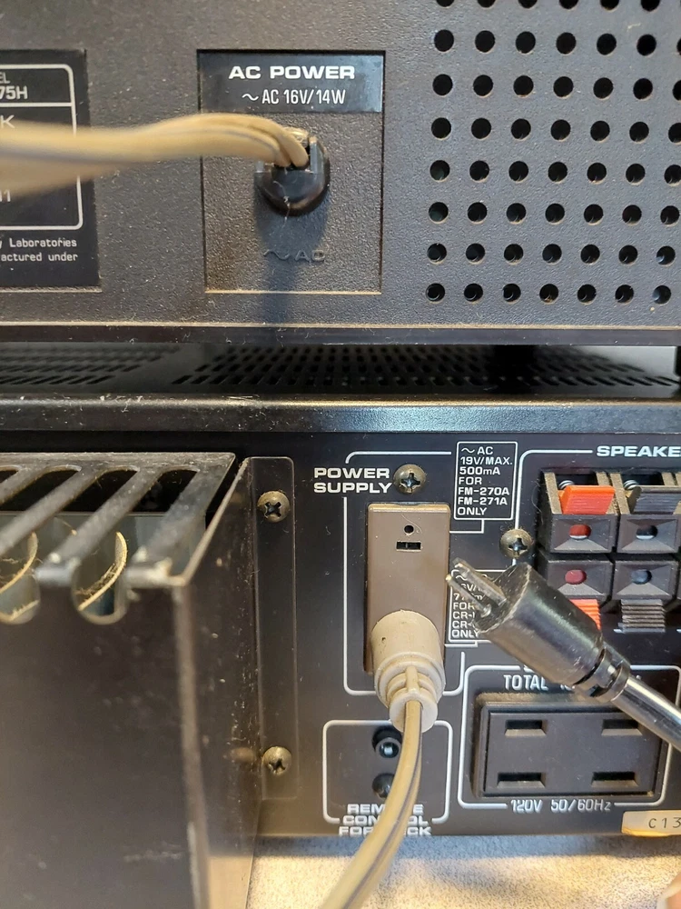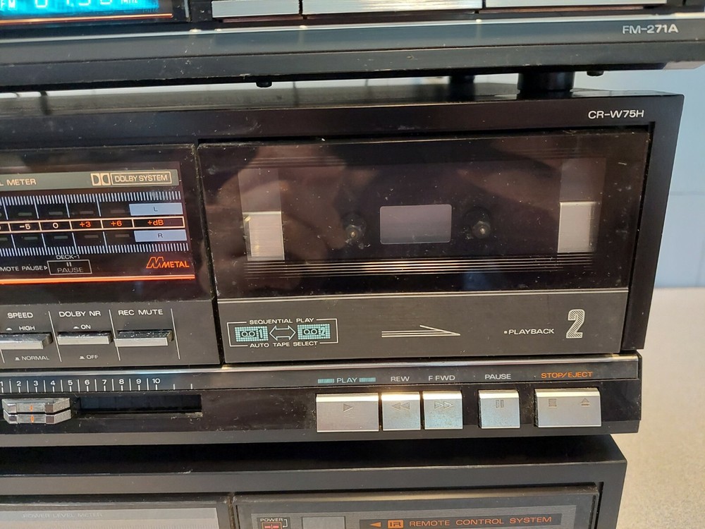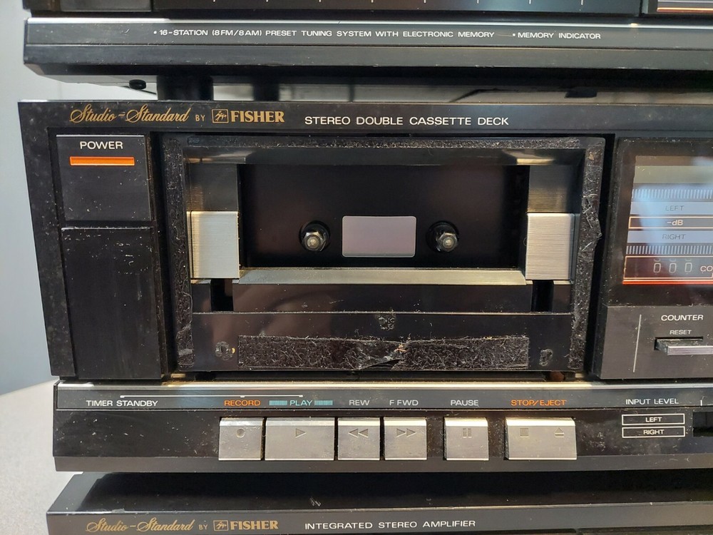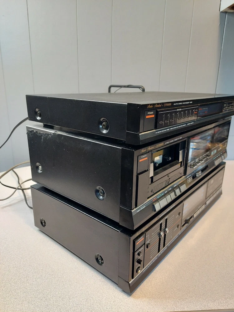 Fisher Audio System - CA-W75H Amp, CR-W75H Tape, FM-271A Tuner; Free Shipping! Hello, stereo fans! Today we have a three-piece audio component stereo. While we have this listed as for PARTS or REPAIR, two of the three components are working just fine. The CA-W75H Integrated Stereo Amplifier IS WORKING. This amp has two odd, proprietary power outlets in the back, which accept the integral power cords from the other two components. The FM-271A AM/FM Stereo Synthesized Tuner IS WORKING as well. The CR-W75H Stereo Double Cassette Deck is where the "PARTS or REPAIR" part of this listing comes in. It does power on, but neither of the two cassette decks work. It is also missing part of the left side cassette door (this is mainly cosmetic damage, as you can still insert a cassette and close the door). In addition, there is a good deal of cosmetic damage to the finish on the top of this component. Please see photos for physical and cosmetic condition. Shipping will be via either USPS Priority Mail, Federal Express, or USPS; whichever of the three proves most cost-efficient. Please note that as we are listing this as for PARTS or REPAIR, we are selling this AS-IS with No Returns. Thank you for looking!