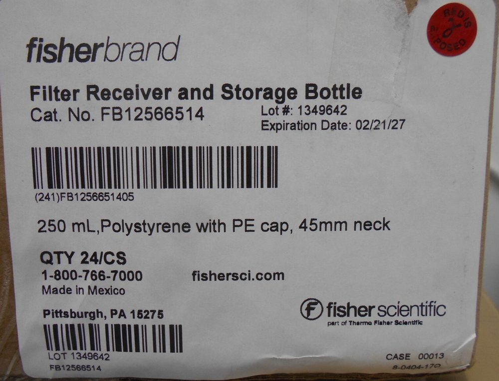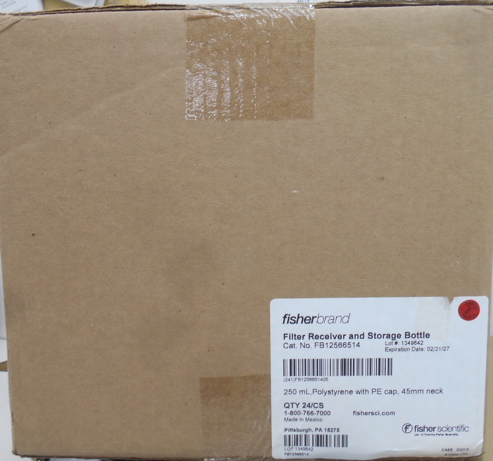Fisher Brand Description: NM Inventory Location: NB 40 2ND 11-3 Fisher Brand FB12566514 Filter Receiver and Storage Bottle 250ml Polystyrene with PE Cap 45mm Neck 24/CS WE DO NOT DO FREE SHIPPING THIS SALE IS FOR JUST WHAT IS SHOWN IN THE PICTURES OR MENTIONED IN THE DESCRIPTION. THERE ARE NO ADDITIONAL PARTS, CABLES, SOFTWARE, POWER SUPPLIES, AC ADAPTERS, TUBING, OR ANY OTHER ACCESSORIES INCLUDED UNLESS SPECIFICALLY LISTED IN THE DESCRIPTION. Unfortunately the Ebay shipping calculator can often overcharge for shipping especially on smaller items. Please feel free to contact us for an accurate shipping quote or request an alternate shipping method. We ship USPS as well as UPS. We will also be glad to ship against your UPS or Fedex account. We combine shipping costs wherever possible. Customs fees, duties, and taxes are not included in the shipping cost Ready to be shipped: For the most accurate information please look at the pictures provided. Additional pictures and information are available upon request. All items that have been listed, have not been tested, unless otherwise stated. We try to the best of our ability to describe the physical appearance and to provide an accurate description of each item that is being sold, but please refer to the picture or attached link if there is one available for a better description. If you have any questions please contact us for more information. Our goal is to provide the purchaser with as much information as possible. The item you receive may be different from the actual item in the photo in the case of multiple quantity lots. All measurements (lengths, widths, diameters) may not be exact so contact us if you want to ensure an exact measurement. ALL ITEMS ARE SOLD AS IS-WHERE IS. No warranty is implied or given on any items. Our 14 day money back return is offered only for items received damaged, DOA, or not as described. BUYER PAYS 6RETURN SHIPPING. Please see our return policy. NCI-Sales/Northern Computers is not responsible or liable for the use/misuse of any item. NCI-Sales 289 Main St Madawaska Me 04756 “The sale of this item may be subject to regulation by the U.S. Food and Drug Administration and state and local regulatory agencies. If so, do not bid on this item unless you are an authorized purchaser. If the item is subject to FDA regulation, I will verify your status as an authorized purchaser of this item before shipping of the item” ***WE DO NOT OFFER FREE SHIPPING ON FREIGHT. WE WILL GIVE YOU A FREIGHT SHIPPING QUOTE PRIOR TO PURCHASE AT YOUR REQUEST.*** Payment We accept the following forms of payment: Pay Pal, Credit Cards over the phone (Visa or Mastercard), or E-check through Pay Pal. We do not ship C.O.D. Items will only be shipped when an E-Check payment has been confirmed and not pending. A Credit Card Purchase is only shipped when the money is transferred from the Credit Card Processing Company to our banking account. Payment is mandatory within 5 business days of purchase. A non-paying bidder case will automatically be initiated after this time. Please contact us prior to this if there is a payment issue. Shipment Packages will be shipped via UPS ground, FED EX ground, or USPS priority mail. UPS/FEDEX WILL NOT SHIP TO P.O. BOXES. If special shipping requirements are needed this will be done on a case by case basis. All items except freight will generally be shipped within one business day of payment. All tracking information will be uploaded once items are picked up. It is not our standard practice to ship outside of North America, but special arrangements can be made. All Canadian purchases are shipped with UPS standard international ground. Under certain cases USPS shipping to Canada is available. We can also ship packages using purchasers shipping account through FED EX or UPS the Purchaser has to supply the account information and a handling fee will apply. Buyer will pay actual shipping & handling costs which will be calculated at the end of the auction. All customs fees, duties, and taxes are the responsibility of the buyer We combine shipping where possible. Please contact us prior to sale for an accurate shipping quote. We will need your zip code and whether business or residential delivery is required. We do not ship international freight, except to Canada. All items besides freight are shipped insured. The insurance is included in the shipping price. Freight insurance can be purchased at an additional cost. If a package is received damaged the purchaser must keep all original boxes and packing, because these items may have to be viewed by the carrier for the insurance claim. We box all items in a single wall box with bubble wrap and/or paper packing. If you are worried about an item being damaged in shipping please contact us and make special packing arrangements. Buyers may arrange their own Freight/Local Pickup. Palletizing costs for freight items will be charged. Items not picked up within 30 days after payment received will become property of Northern Computers Inc. FEEDBACK POLICY Our feedback is left in reciprocation of buyers feedback
