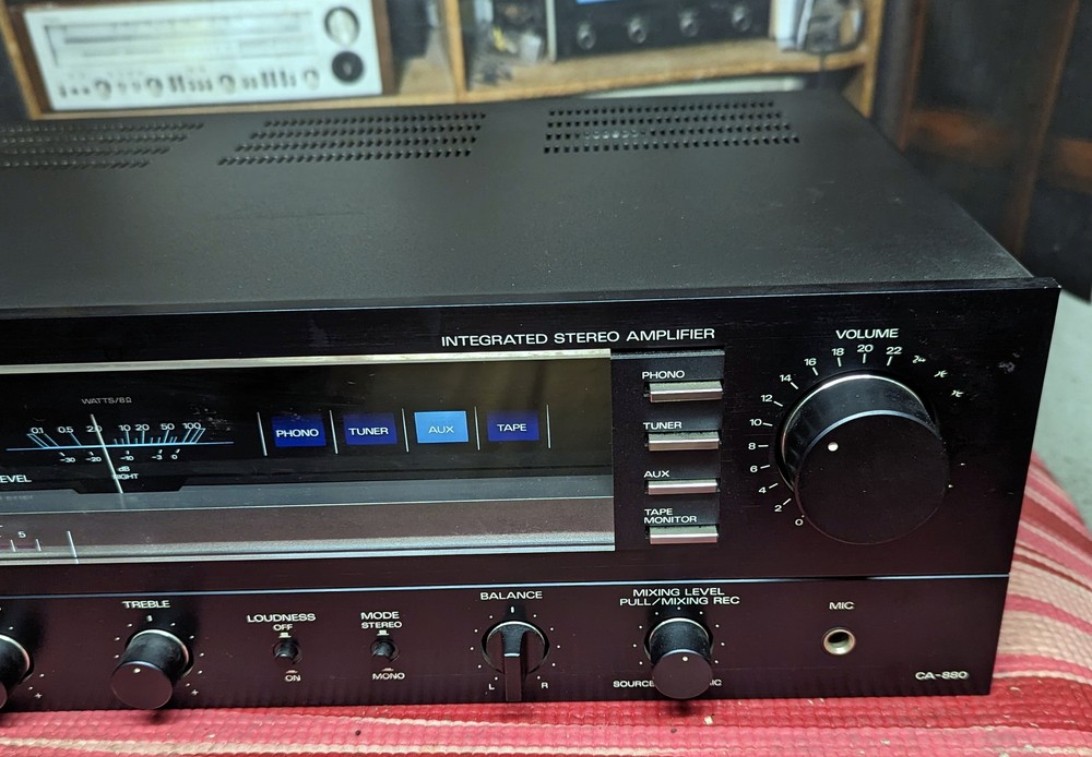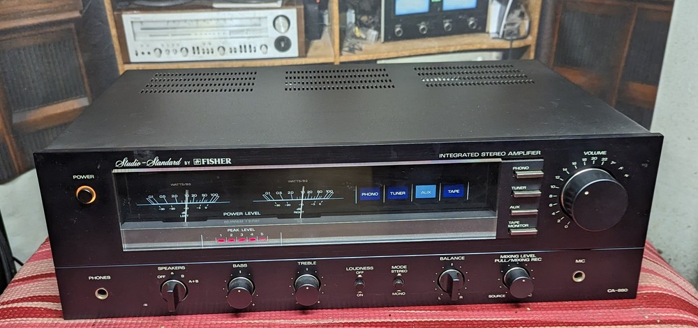 Fisher CA-880 stereo integrated amplifier with analog watt meters. Used but still plays and sounds great. Cosmetically it has a little dust and a few nicks as well as some of the writing to the left of the volume control missing - see pics.