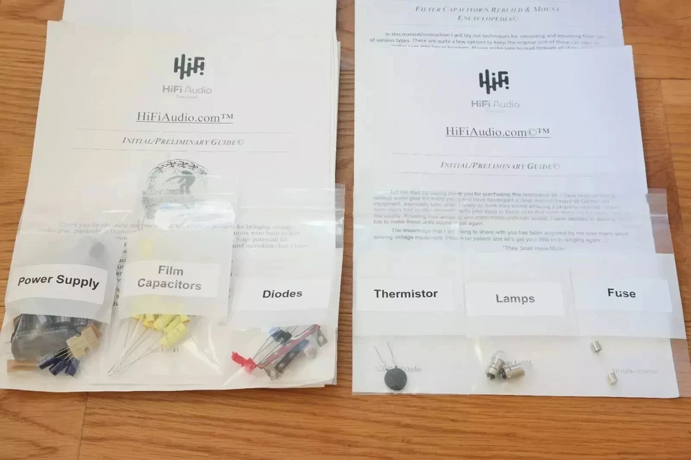 The scarcity of good, honest techs who can do good and reasonably priced restoration/rebuild of audio equipment inspired me to create this restoration kit. In today's day and age, it is difficult to find a knowledgeable technician who can service your audio gear properly. I have seen many poor quality restorations of equipment that cost way too much for their owners. In 99% of the cases, only a few parts were replaced, instead of a full and proper restoration job. A proper restoration must replace all electrolytic, paper, film, oil capacitors. Do not fall for partial kits. This is not a good or proper way to restore your audio equipment. It is the same as with car tires; one should never replace just one tire and keep the other worn-out tires on. A proper rebuild requires a full recap of all oil, paper, lytic capacitors. On the other hand, if one succeeds in finding a good tech, the wait time is usually 6-12 months for the unit to be serviced, and costs are sky-high. I have been servicing audio equipment for many years and have developed deep respect for all good equipment. Knowing how amazing and warm these units can sound, I decided to put together this kit. It includes very good upgrades and improvements that must be done to the unit. This restoration kit will make a huge difference in the sound quality. All the parts are of high-quality Japanese Nichicon / Rubycon / IC / United Chemi capacitors. I am extremely particular about the quality of the parts provided in this kit. Knowing how many bogus/fake caps, diodes, resistors, etc. are out there, I source all the parts from reputable wholesalers and buy them in bulk. Vintage audio equipment has the potential to deliver rich and authentic sound when it is properly restored. Not only can it enhance your listening experience, but it can also evoke memories and bring joy to your life. Let's work together to bring your vintage gear back to its full potential, and make sure you have the music you deserve. ♩♬♫♪♫♩♬ “They Shall Have Music”- Avery Fisher Included in this kit: 1. Power/Filter stage capacitors ( Nichicon / Nippon / United Chemi) electrolytic capacitors. Note, the image with silver multicap cans shown restaffed with new caps is for illustration purpose only. 2. Detailed instruction with colorful images, schematics, manuals (all of these are in electronic form, I consider these much better than printed version due to zoom availability). 3. Schematics (all of these are in electronic form, I consider these much better than printed version due to zoom availability). 4. Complete audio path upgrade with high quality US made (IC) or Nippon audio grade film capacitors. 5. Parts for compete recap of all the electrolytic capacitors. 6. Complete recap of all oil, film, paper, lytic caps. 7. fuse/s 8. Instructions on how to clean the chassis. 9. Instructions on how to clean a faceplate 10. Instructions on how to polish knob covers. 11. Support/help to a reasonable extend in case you need it. (This is what makes us different from other sellers.) We also offer a great selection of Restoration Kits , LED conversion kits , Volume Controls , Rotary Switches and other rare/unique parts; Make sure to check our store ---------> LINK (Use the search bar inside the shop to find what you need faster) We may also be interested in purchasing your equipment