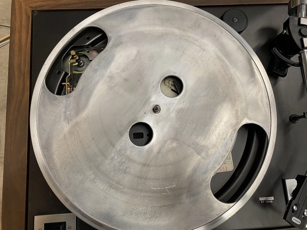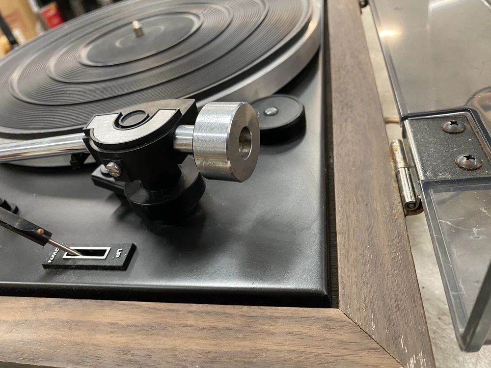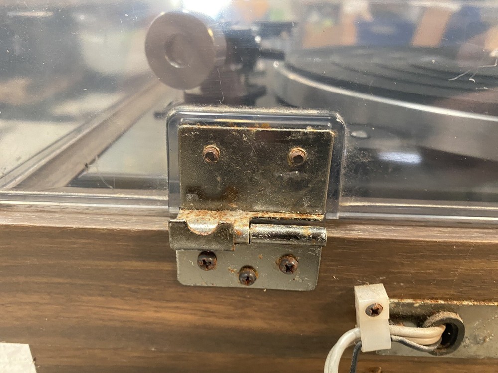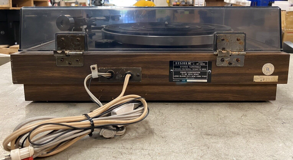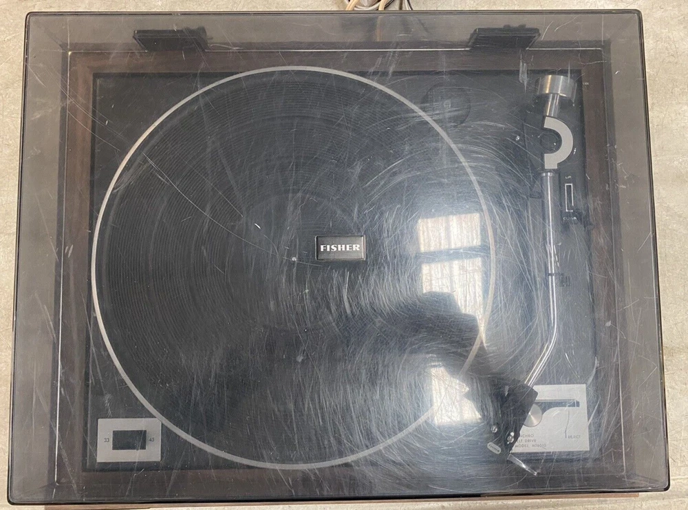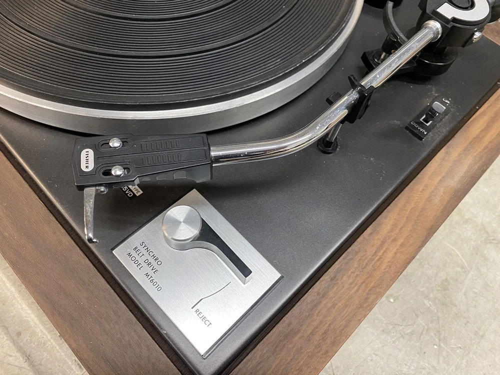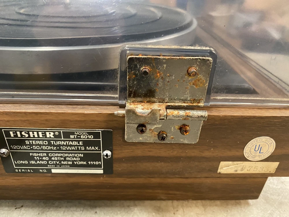 Fisher MT-6010 Turntable - WORKS - MISSING COUNTER WEIGHT - READ DESC Unit powers on and spins, while the belt absolutely needs replacing it surprisingly had enough life left in it to spin the table pretty decently. The unit is missing it's counter weight, so I wasn't able to fully properly test the cartridge/stylus without it trying to slide down the record. However, by just holding the turntable arm in place and letting the record spin I am able to confirm that the stylus did indeed actually play the record, and with relatively little noise/static. I think the stylus likely old enough that it should be replaced, but is probably still in working condition. The cosmetic condition of the unit is pretty good overall, with light scratching throughout the dust cover, and rust on the hinges, but no major damage anywhere on the unit. The unit also appears to have an after market power cable attached, and has no pitchfork on the ground wire (which might be standard for these units, I'm not sure). NO original packaging, manuals, or other accessories included Feel free to message with any questions related to this listing. We do not accept returns on known broken/for parts, untested, or bulk/lot sale units. We only reply to direct messages and ship packages during our business hours of Monday-Friday 9AM-5PM PST