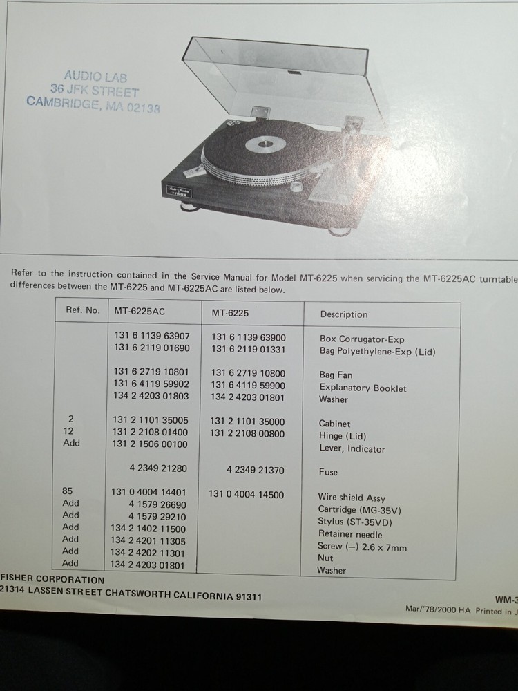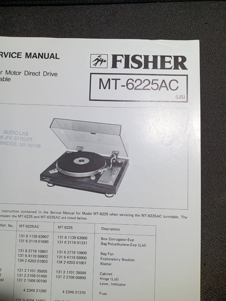 I am selling a Fisher MT-6225AC Service Manual Linear Motor Direct Drive Turntable Original.. Item was used at a repair center .. Item will be shipped USPS First Class or Media Mail..